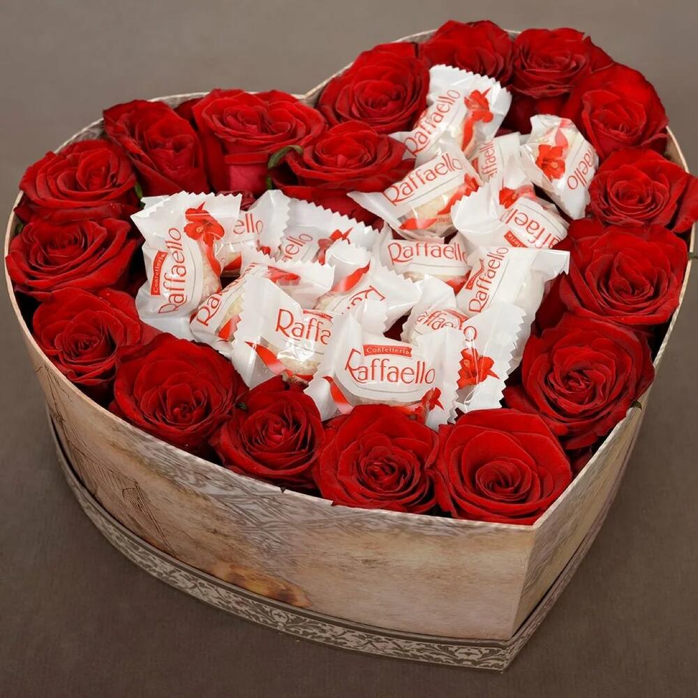 Роза Россия - 17 шт. Коробка сердце - 1 шт. Оазис флористический - 2 шт. раффаэлло 150 гр - 1 шт.