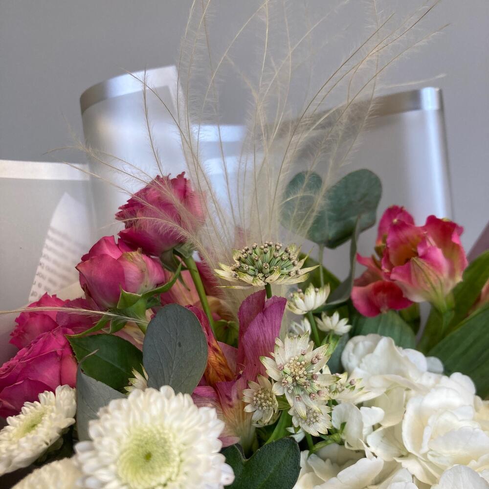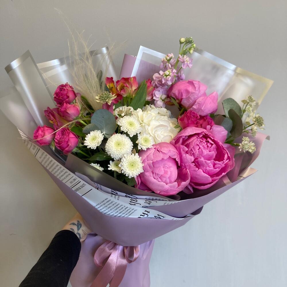 Альстромерия – 2 шт. Гортензия – 1 шт. Маттиола – 1 шт. Пион – 3 шт. Эвкалипт – 1 шт. Кустовая роза – 2 шт. Кустовая хризантема – 1 шт. Фисташка – 1 шт. Астранция – 2 шт. Стифа – 1 шт.