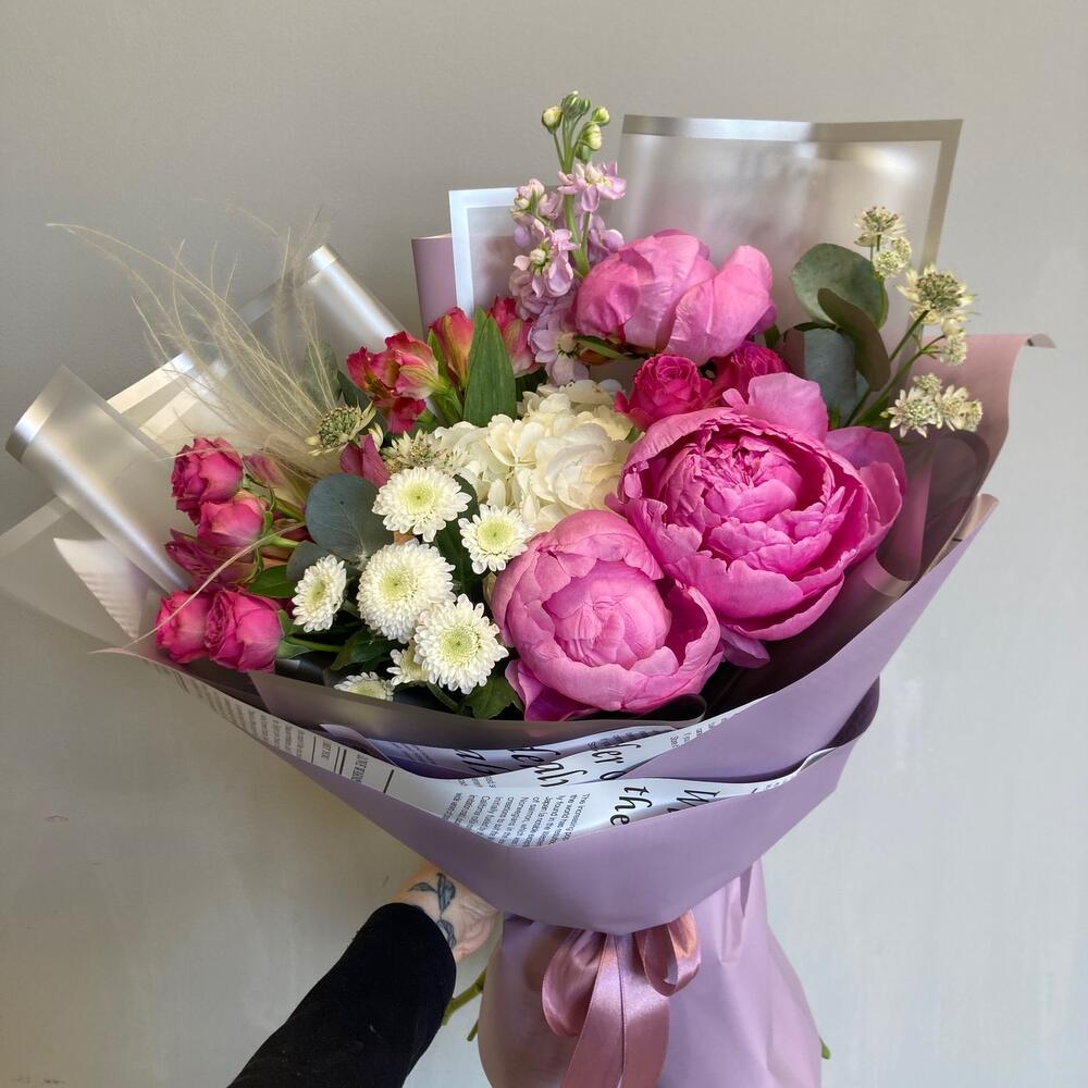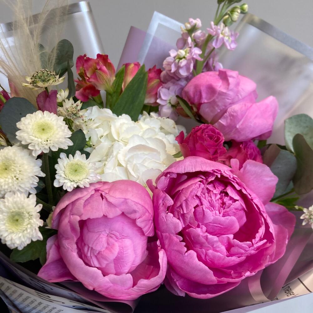 Альстромерия - 2 шт. Гортензия - 1 шт. Маттиола - 1 шт. Пион - 3 шт. Эвкалипт - 1 шт. Кустовая роза - 2 шт. Кустовая хризантема - 1 шт. Фисташка - 1 шт. Астранция - 2 шт. Стифа - 1 шт.