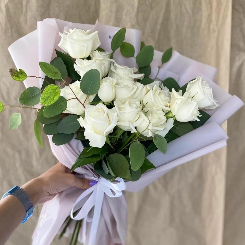 Роза Аваланж - 13 шт. Эвкалипт - 3 шт. Атласная лента - 1 шт. Матовая пленка - 5 шт.