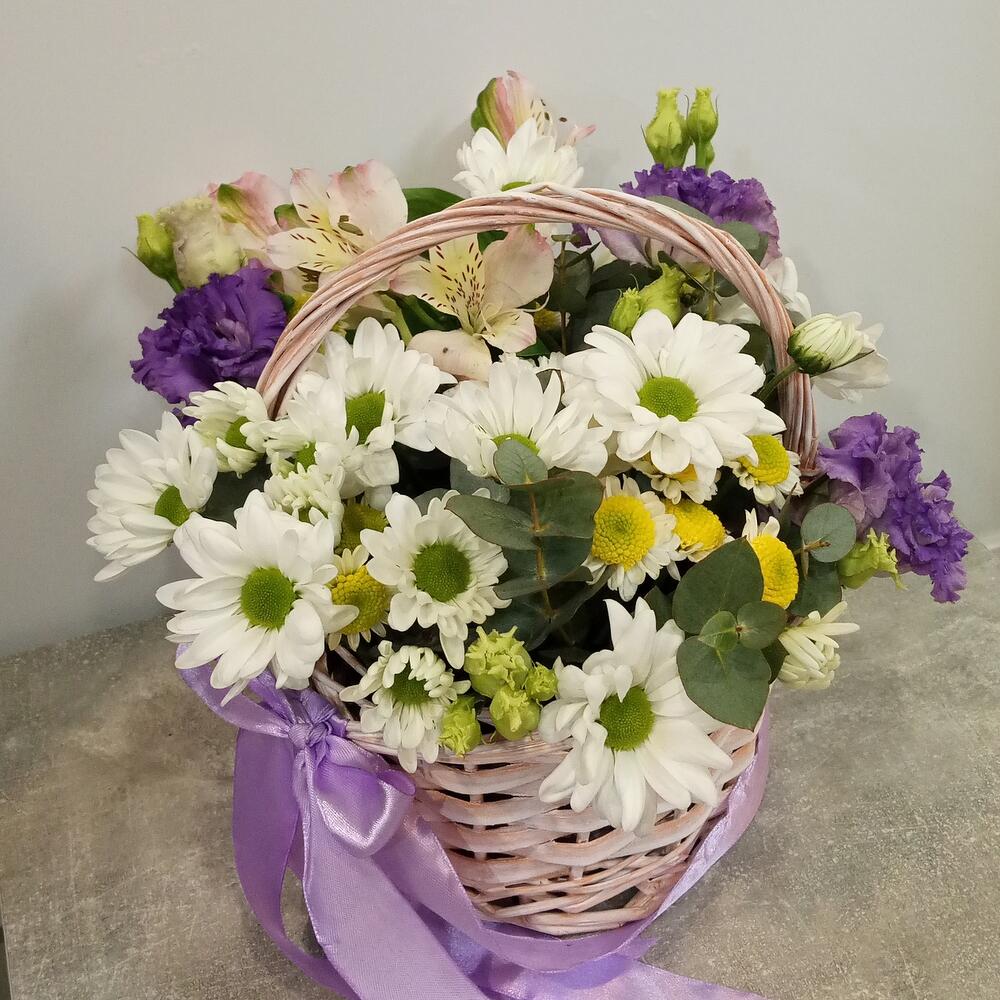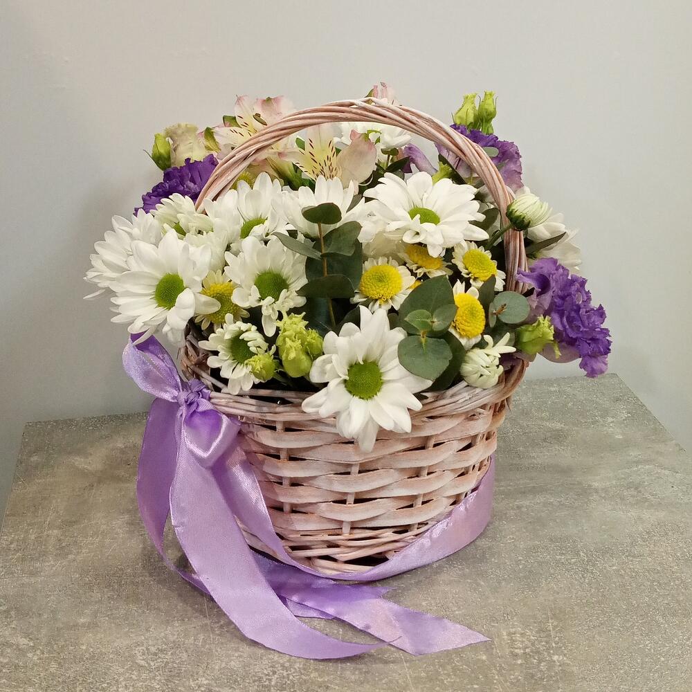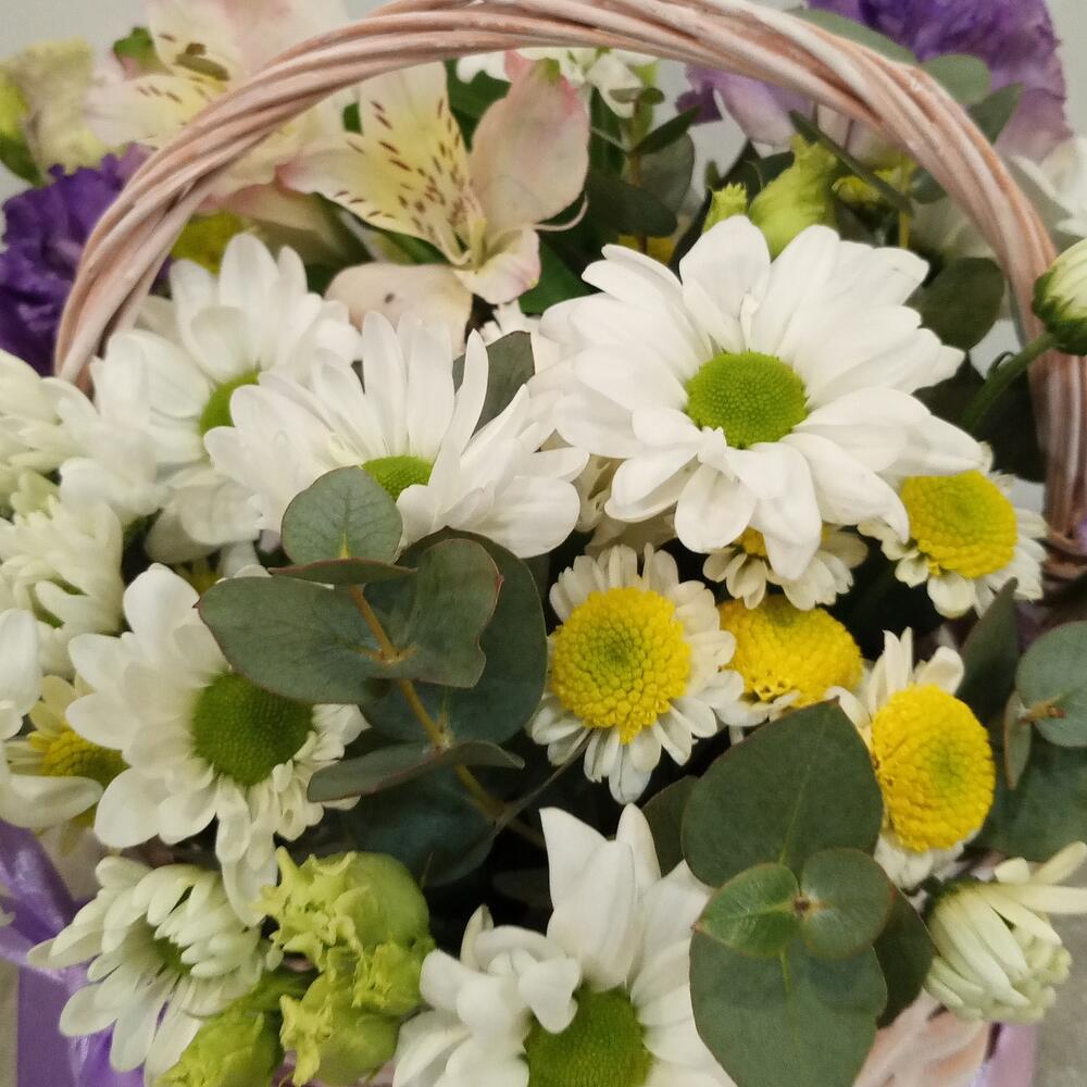Альстромерия - 1 шт. Хризантема кустовая - 1 шт. Эвкалипт - 2 шт. Эустома - 1 шт. Сантини - 1 шт. Корзина плетеная - 1 шт. Оазис флористический - 1 шт.