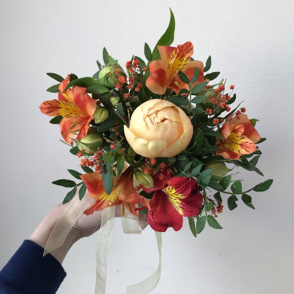 Альстромерия – 1 шт. Гипсофила – 1 шт. Кустовая роза – 1 шт. Лента атласная – 1 шт. Фисташка – 1 шт. Оазис флористический – 1 шт. конус картонный – 1 шт.