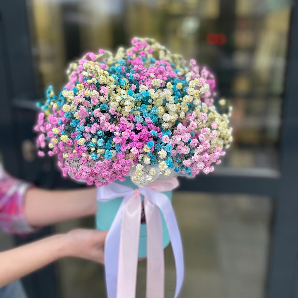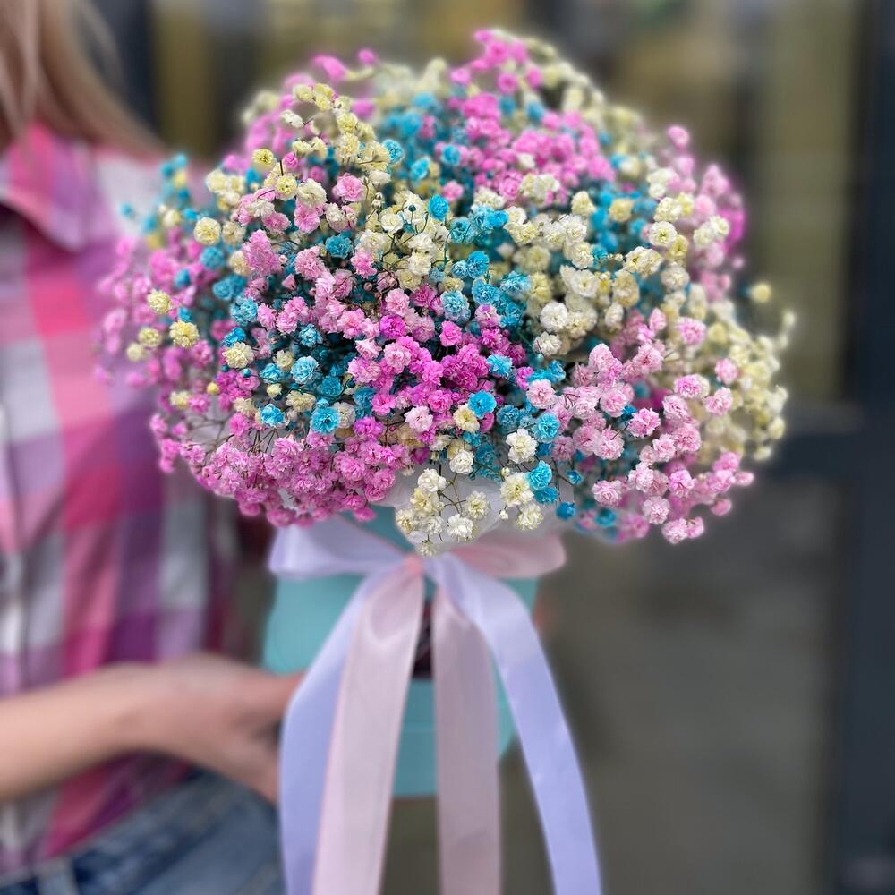 Лента атласная - 2 шт. Коробка шляпная - 1 шт. Открыточка с вашими пожеланиями - 1 шт. гипсофила радужная - 9 шт.