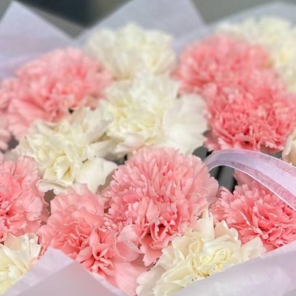 Лента атласная – 1 шт. Диантус – 19 шт. Упаковка дизайнерская – 1 шт. Открыточка с вашими пожеланиями – 1 шт.