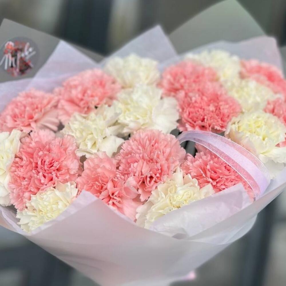 Лента атласная - 1 шт. Диантус - 19 шт. Упаковка дизайнерская - 1 шт. Открыточка с вашими пожеланиями - 1 шт.