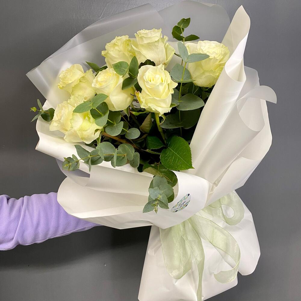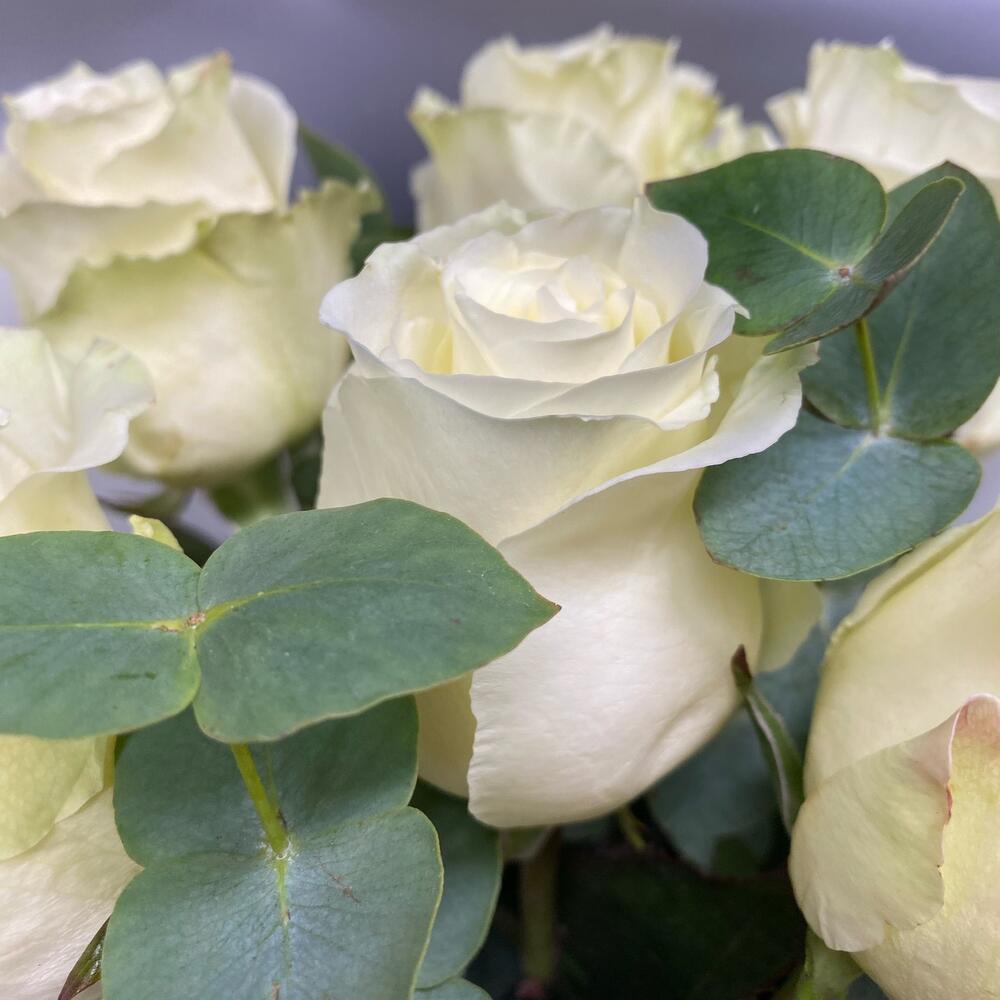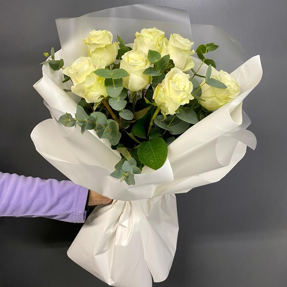 Упаковка дизайнерская – 1 шт. Лента органза – 1 шт. Роза Мондиаль – 7 шт. Эвкалипт пучок – 1 шт.