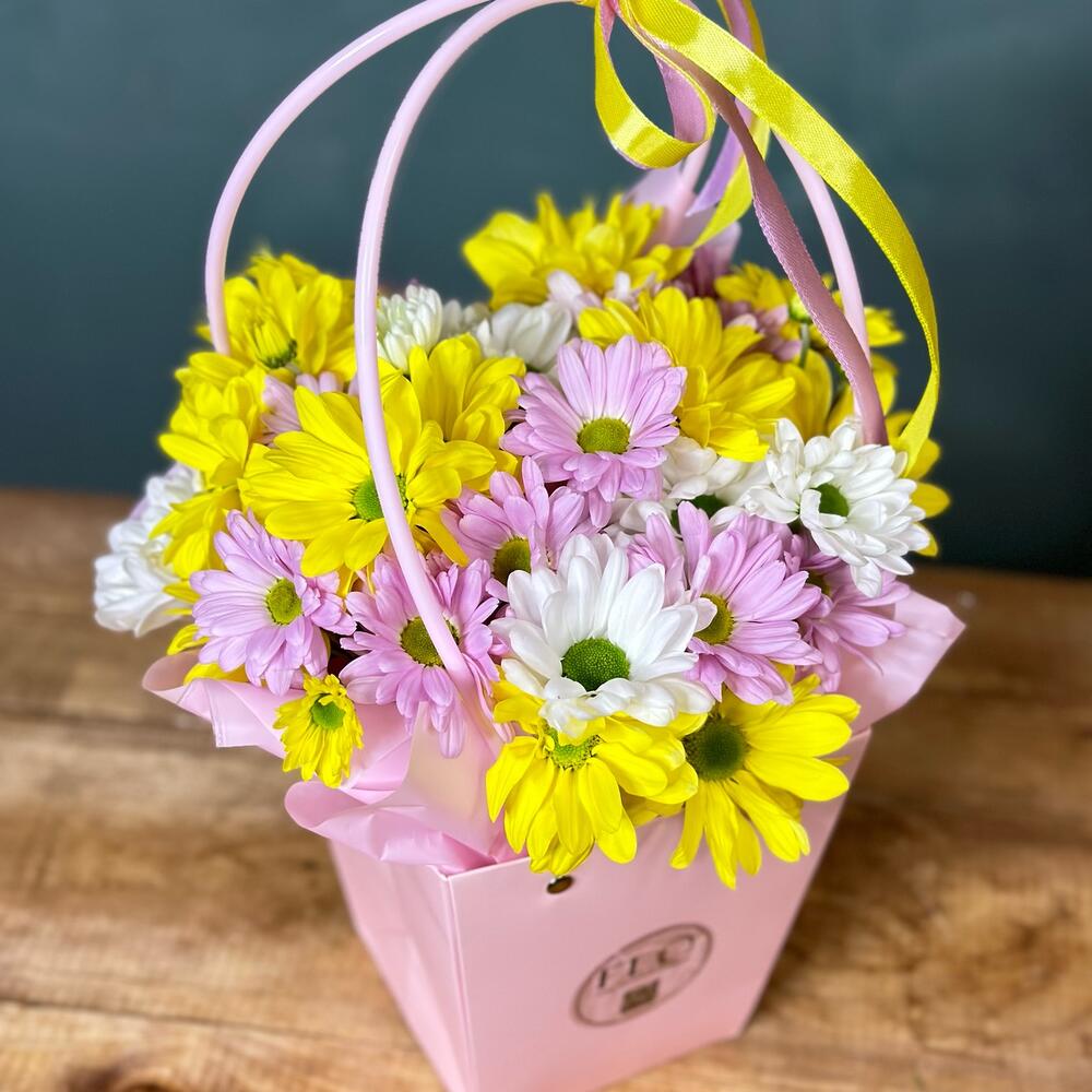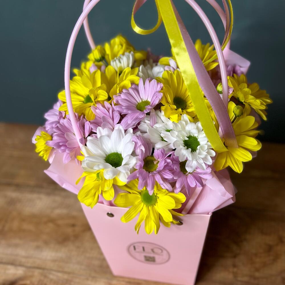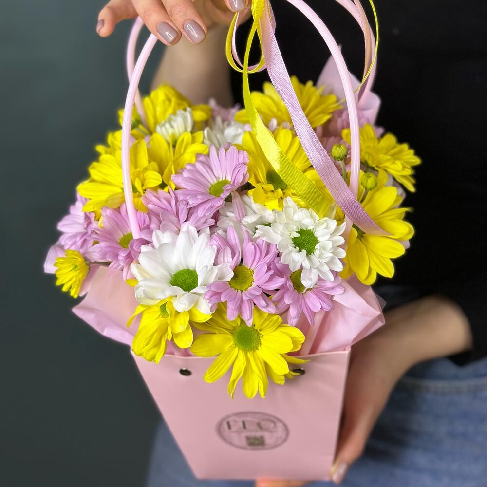 Лента – 2 шт. хризантема ромашковидная кустовая белая – 3 шт. плайм пакет с ручками – 1 шт.