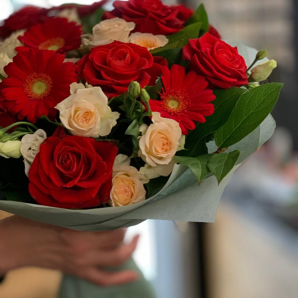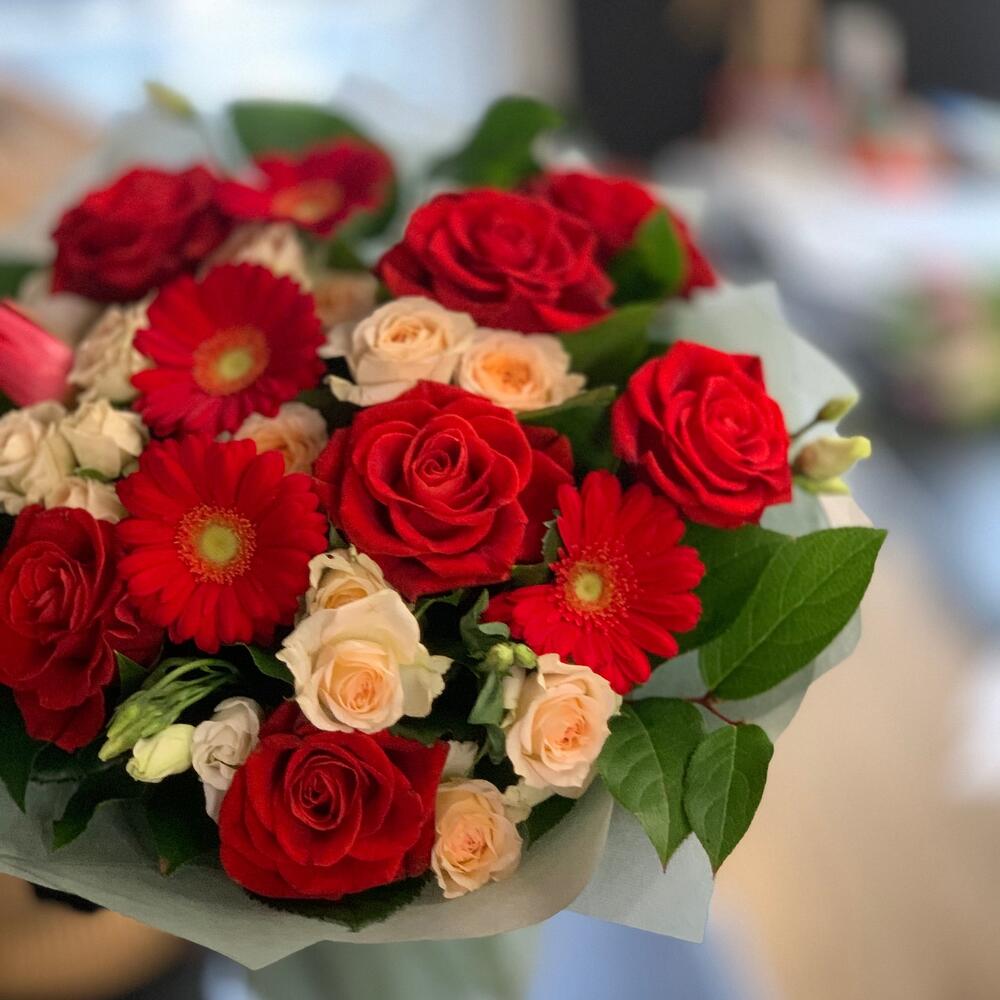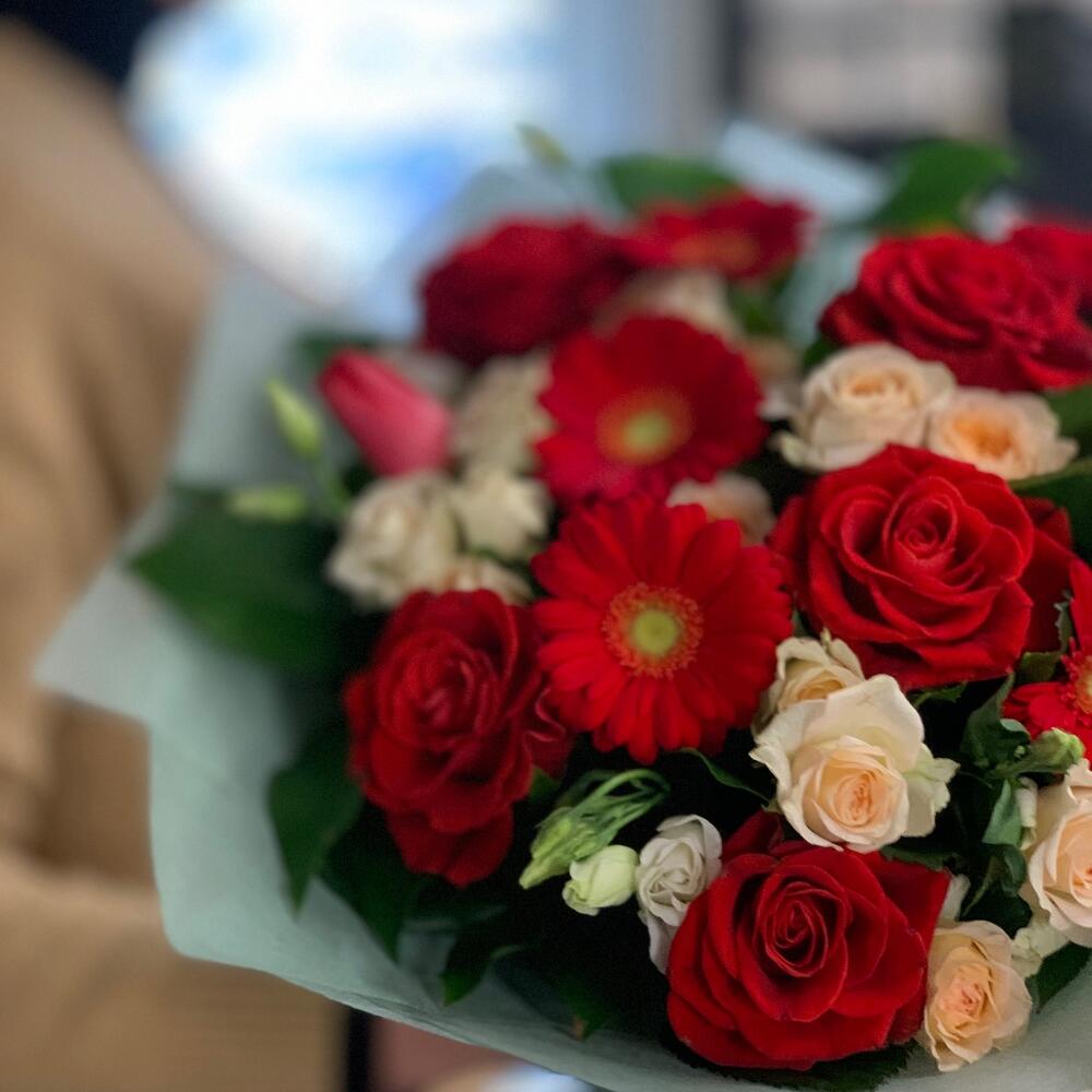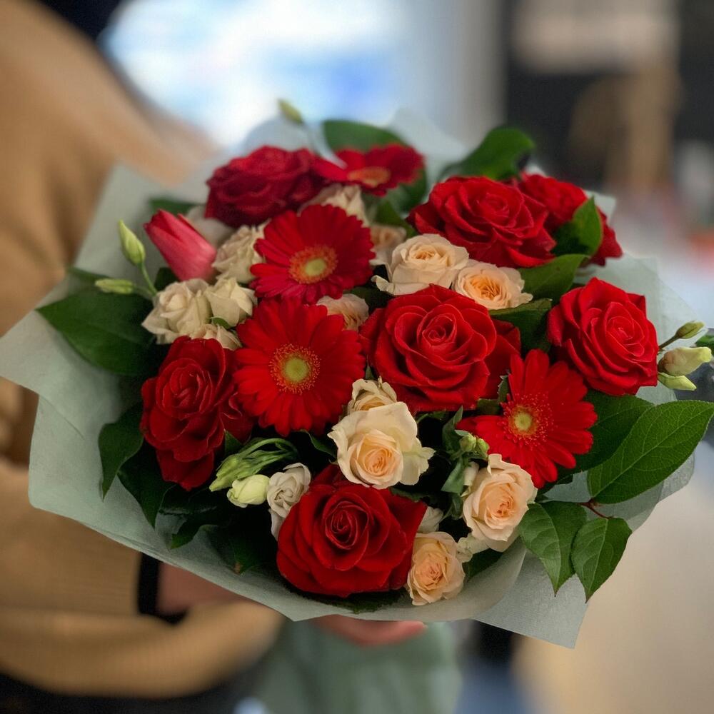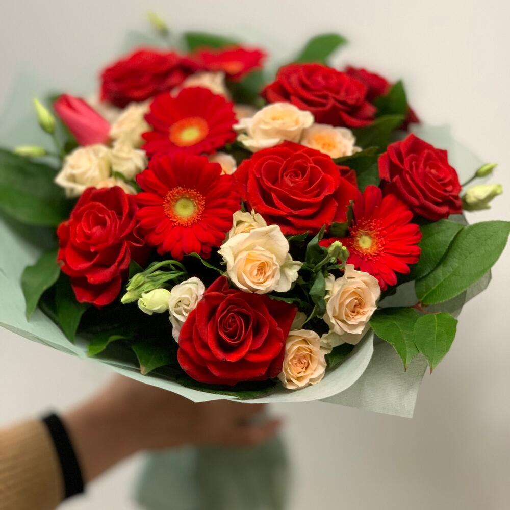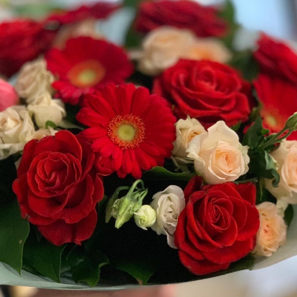 Яркий букет из Герберы, роз и эустомы в красно-белой гамме