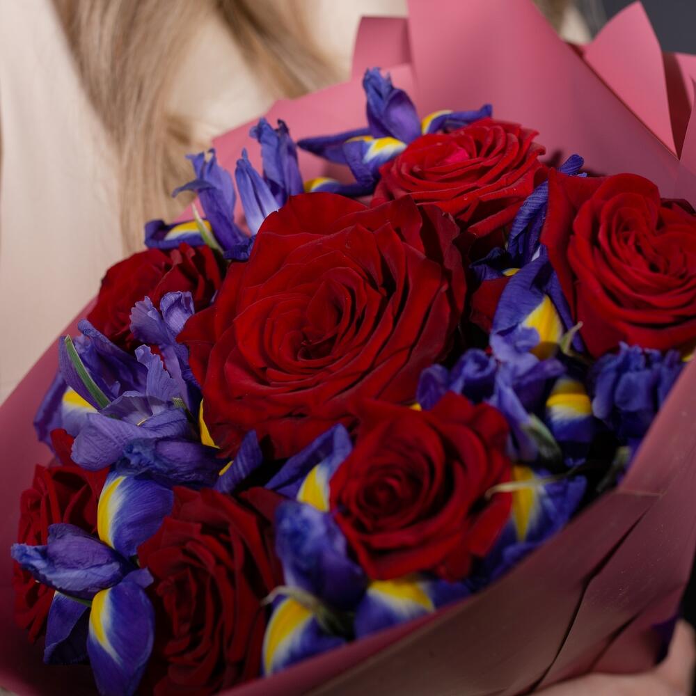 Яркий букет роз с ирисами