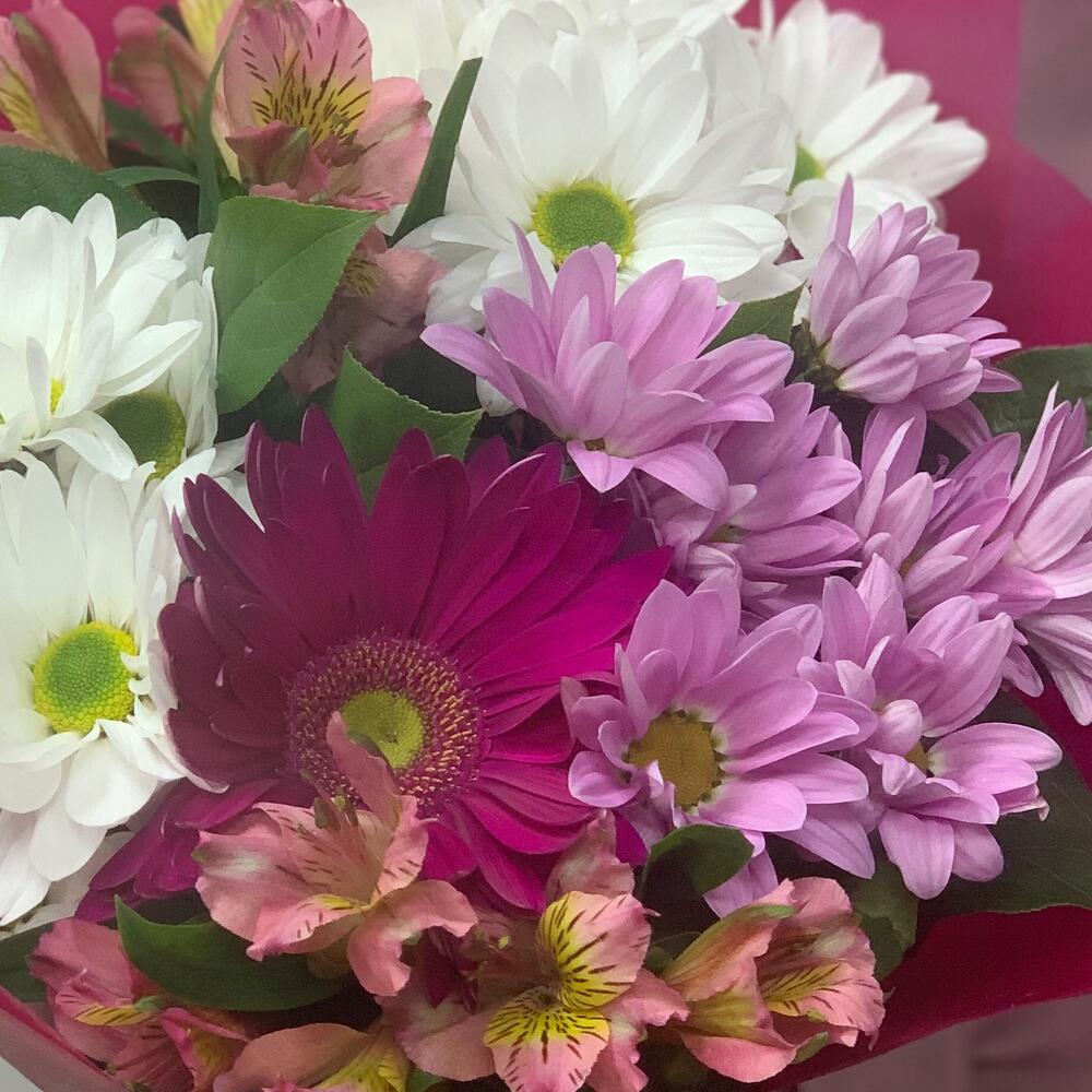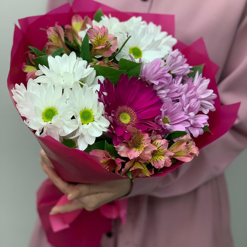 Писташ - 3 шт. Лента атласная - 1 шт. Альстромерия розовая - 2 шт. Упаковка дизайнерская - 1 шт. Хризантема бакарди белая - 2 шт. Хризантема гранд пинк - 1 шт. гербера фуксия - 1 шт.