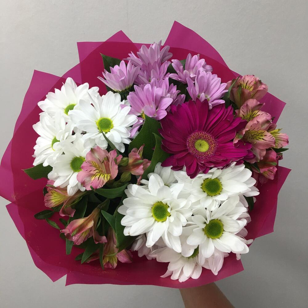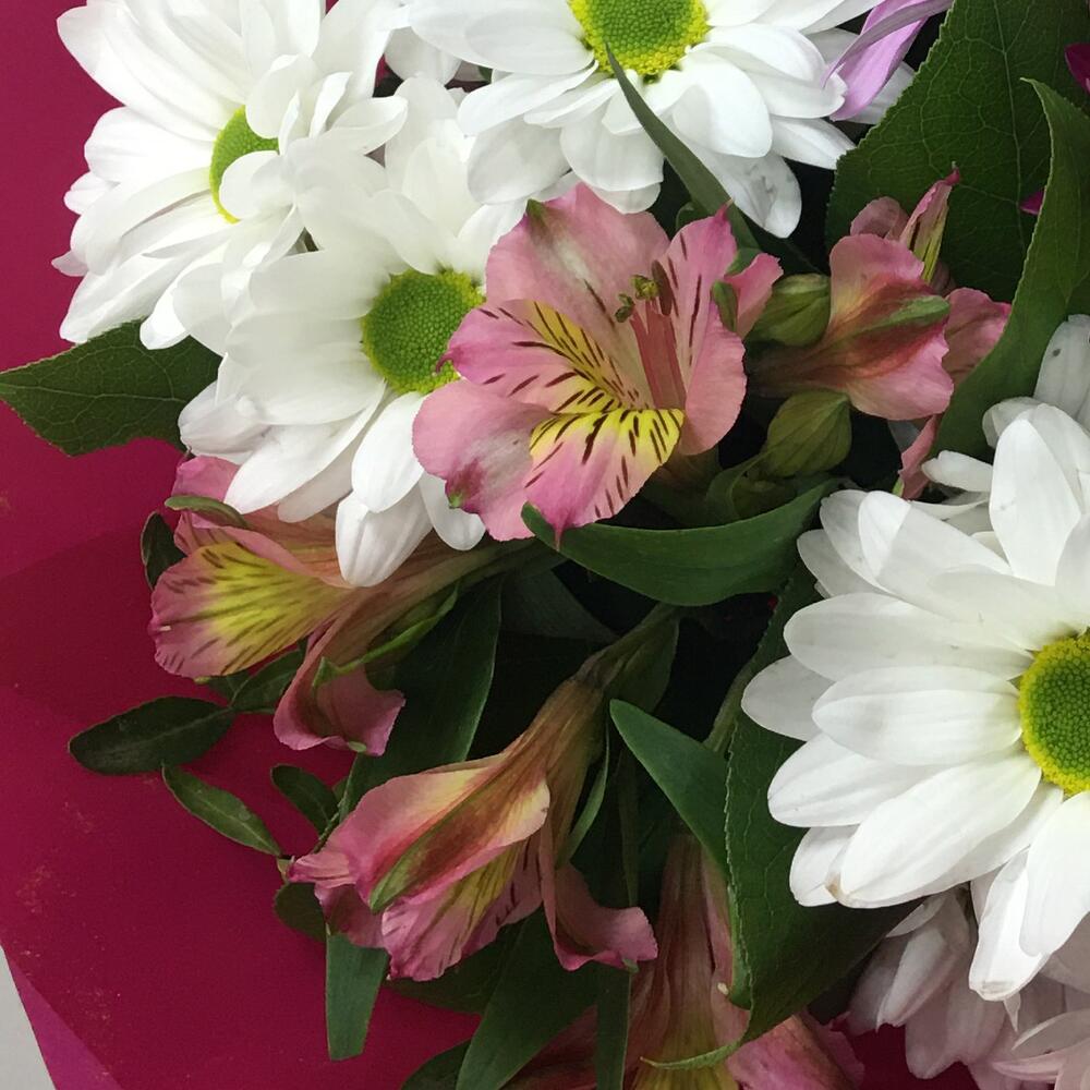 Писташ – 3 шт. Лента атласная – 1 шт. Альстромерия розовая – 2 шт. Упаковка дизайнерская – 1 шт. Хризантема бакарди белая – 2 шт. Хризантема гранд пинк – 1 шт. гербера фуксия – 1 шт.