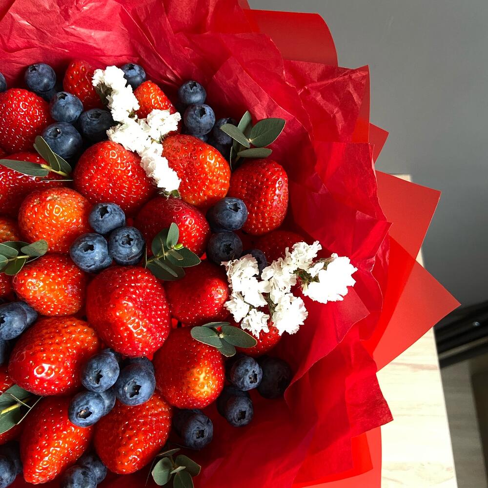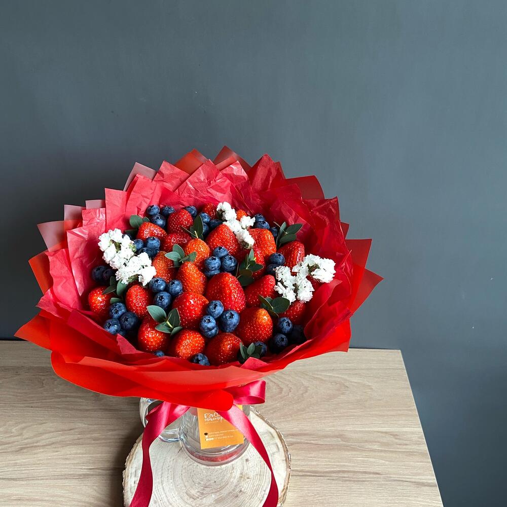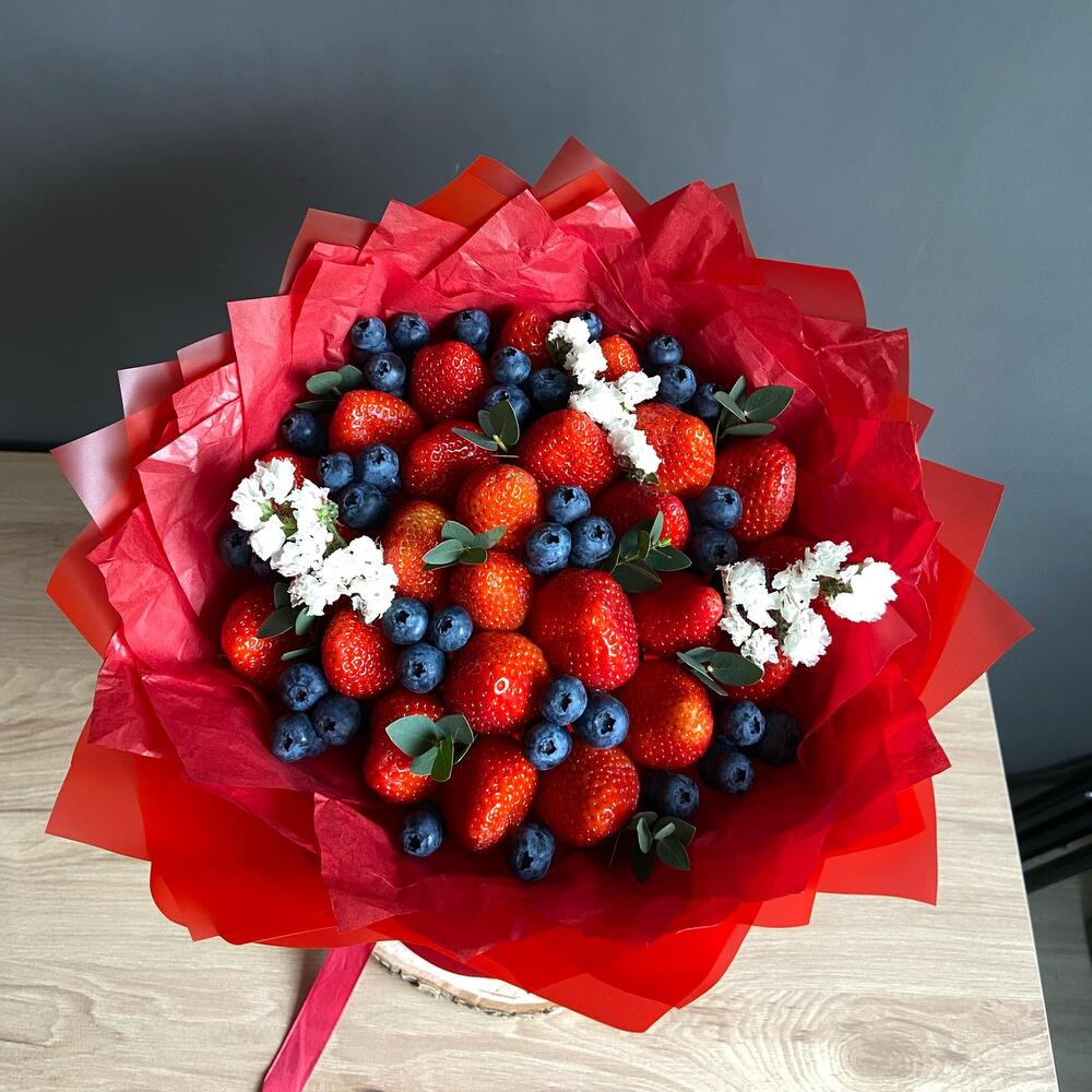Клубника - 500 гр. Эвкалипт - 1 шт. Голубика - 100 гр. упаковка флористическая - 2 шт. статица ветка - 1 шт.