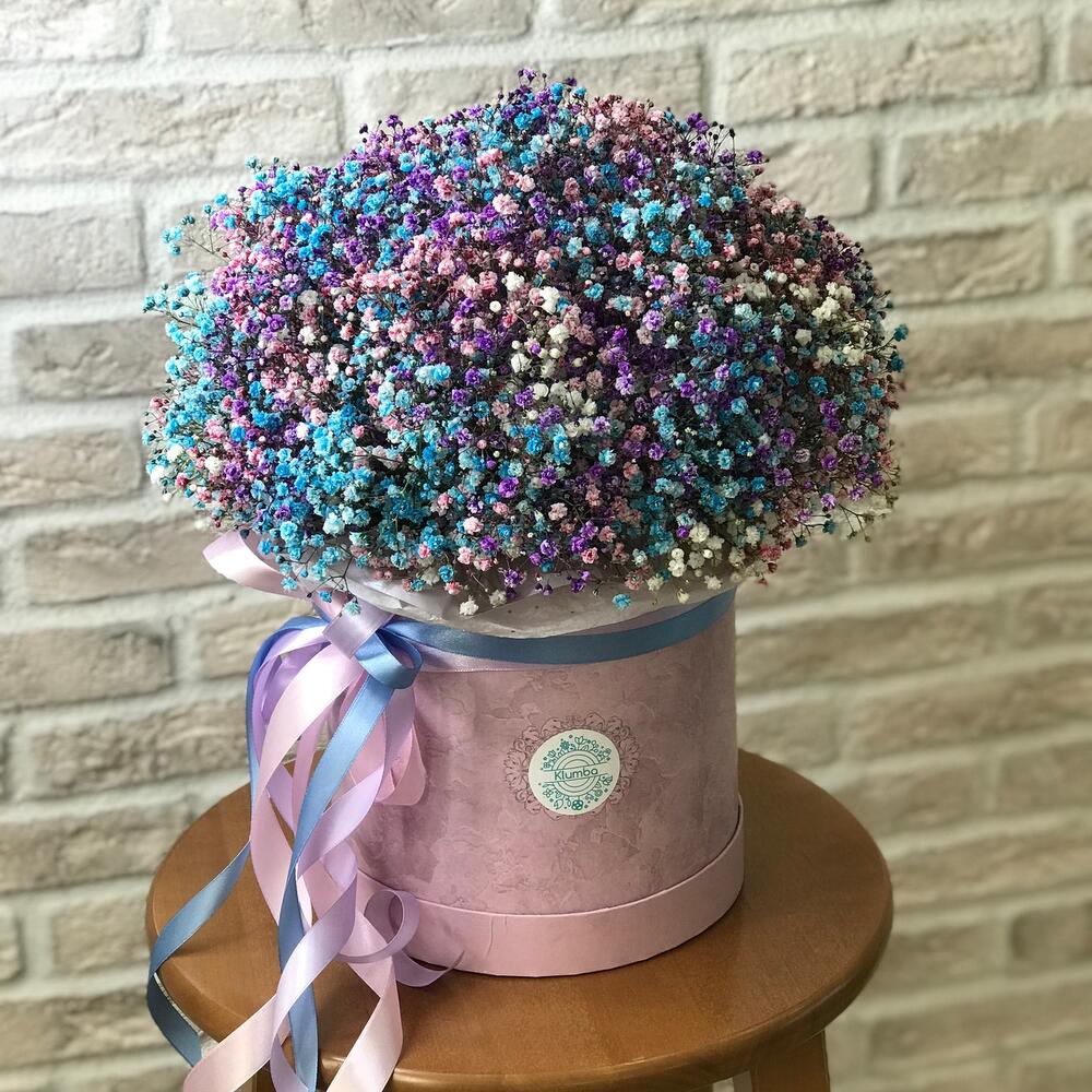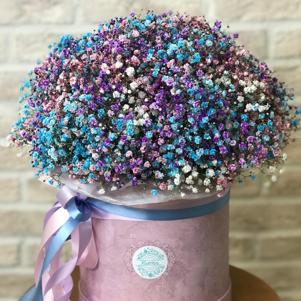 Гипсофила - 11 шт. Лента атласная - 2 шт. Тишью - 1 шт. Коробка шляпная - 1 шт. Оазис флористический - 1 шт.