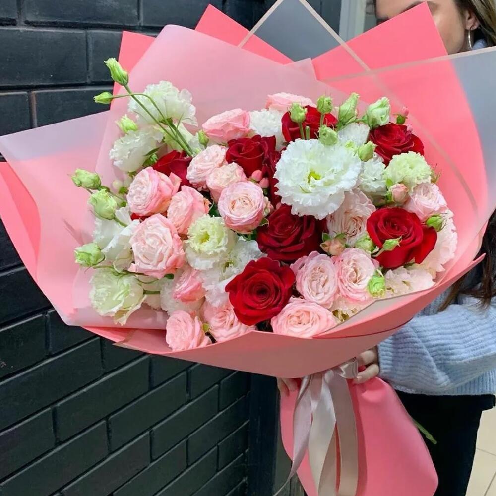 Роза красная – 7 шт. Кустовая роза – 7 шт. Лента атласная – 1 шт. эустома белая – 7 шт. Матовая пленка – 2 шт. Фоамиран (упаковка) – 3 шт.