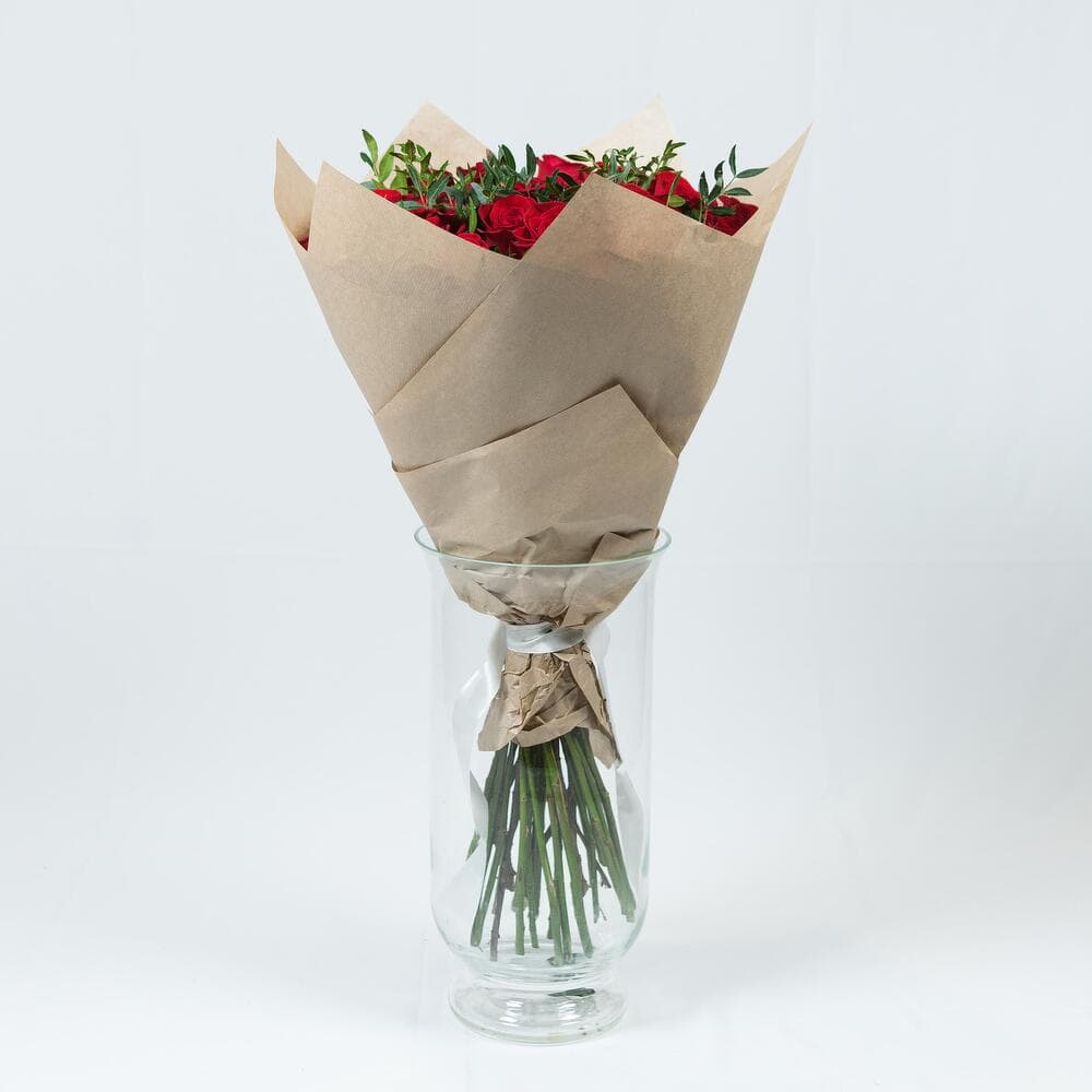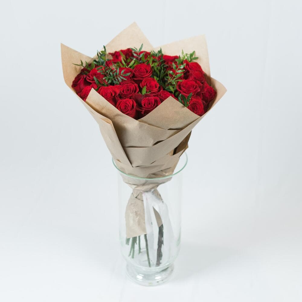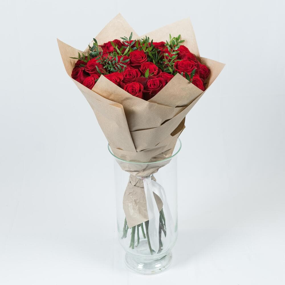 Доставка цветов в Москве—25 роз explorer PREMIUM 50 см в крафте с зеленью