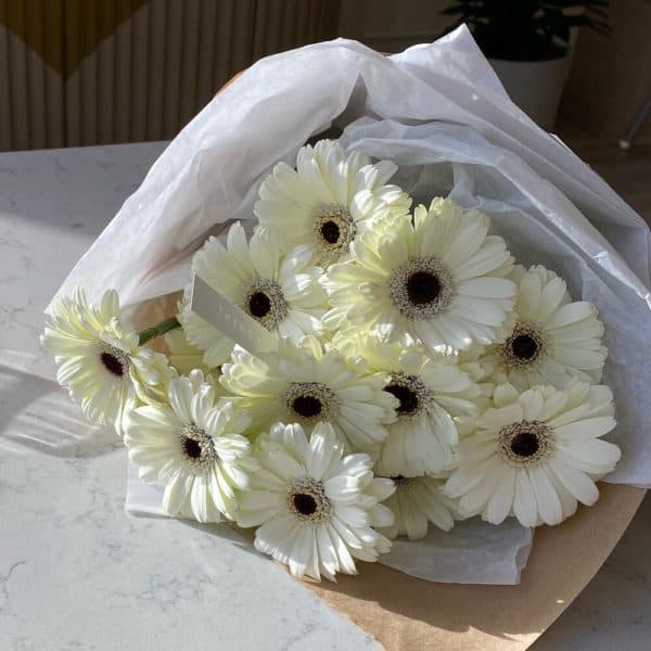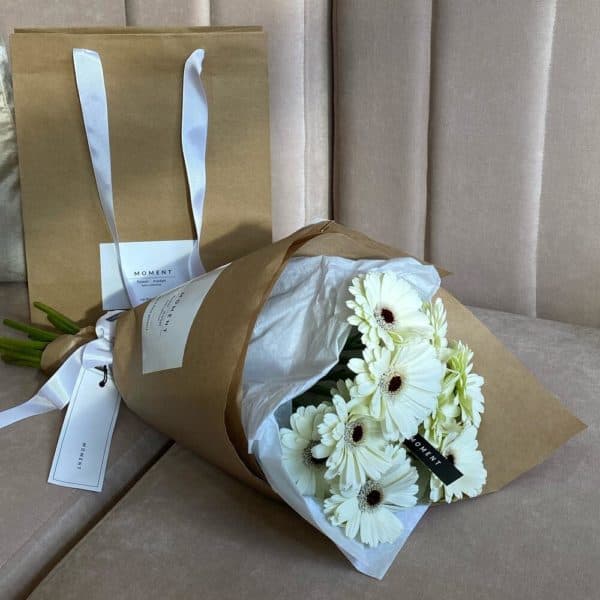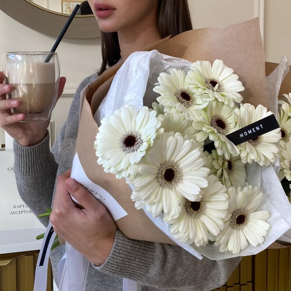 Букет белоснежных гербер, упакован в нежную тишью и крафтовую бумагу.Все наши букеты мы доставляем в фирменном оформлении. Пакет мы используем для комфортной транспортировки цветов, и это стало неотъемлемой частью нашего оригинального дизайна.Преимущественно, мы используем натуральные материалы для изготовления своих продуктов.Moment- eco friendly brand. По желанию, подпишем карточку к вашему букету, укажите это в примечаниях.Ценность нашей работы в ваших лучших МОМЕНТах. С любовью, доставка цветов Цветы Тут