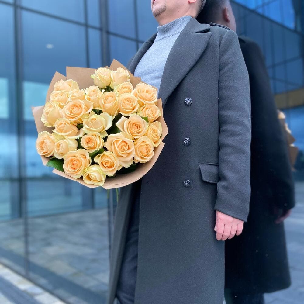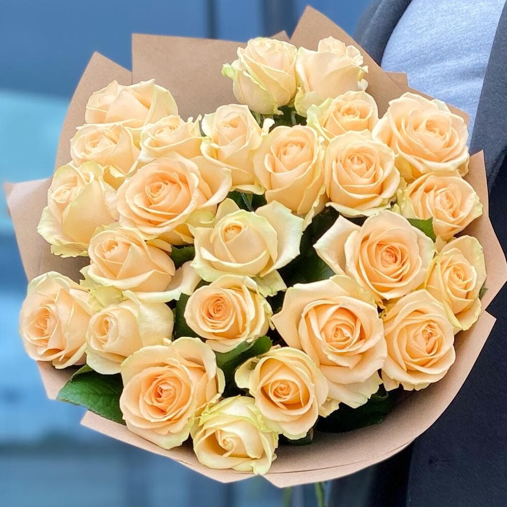 25 кремовых роз эквадор премиум 60 см – 25 шт.Крафт упаковка – 1 шт.Лента атласная – 1 шт.