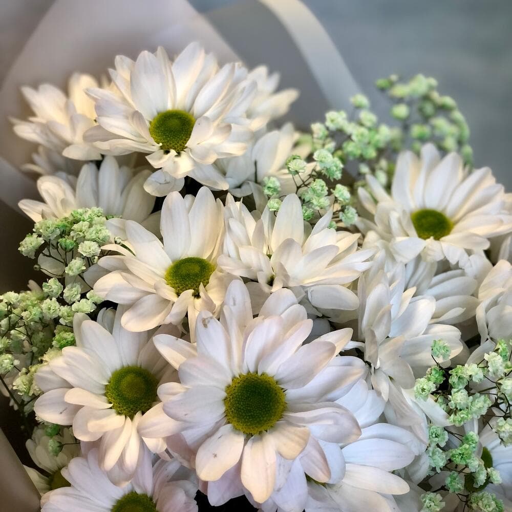 Хризантема кустовая - 3 шт.Гипсофила - 1 шт.Рускус - 1 шт.Упаковка дизайнерская - 2 шт.