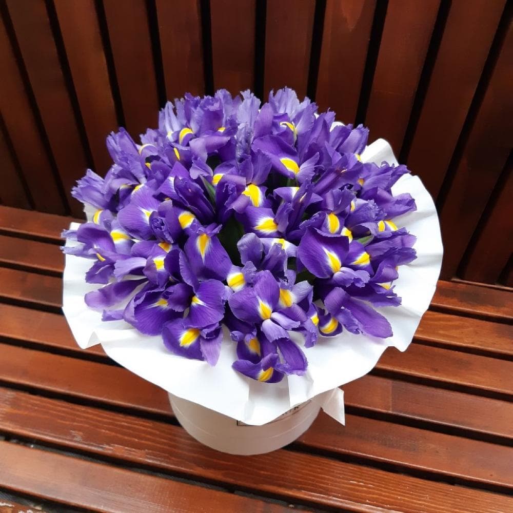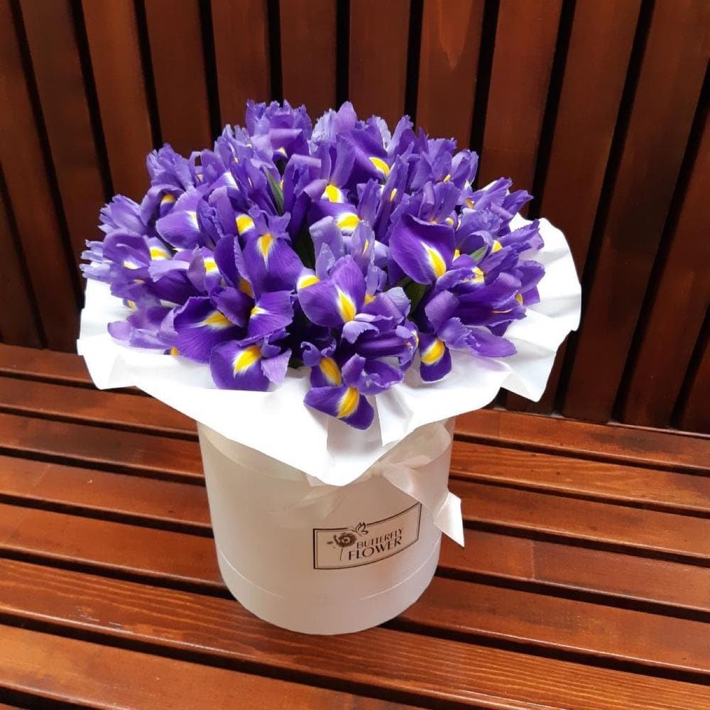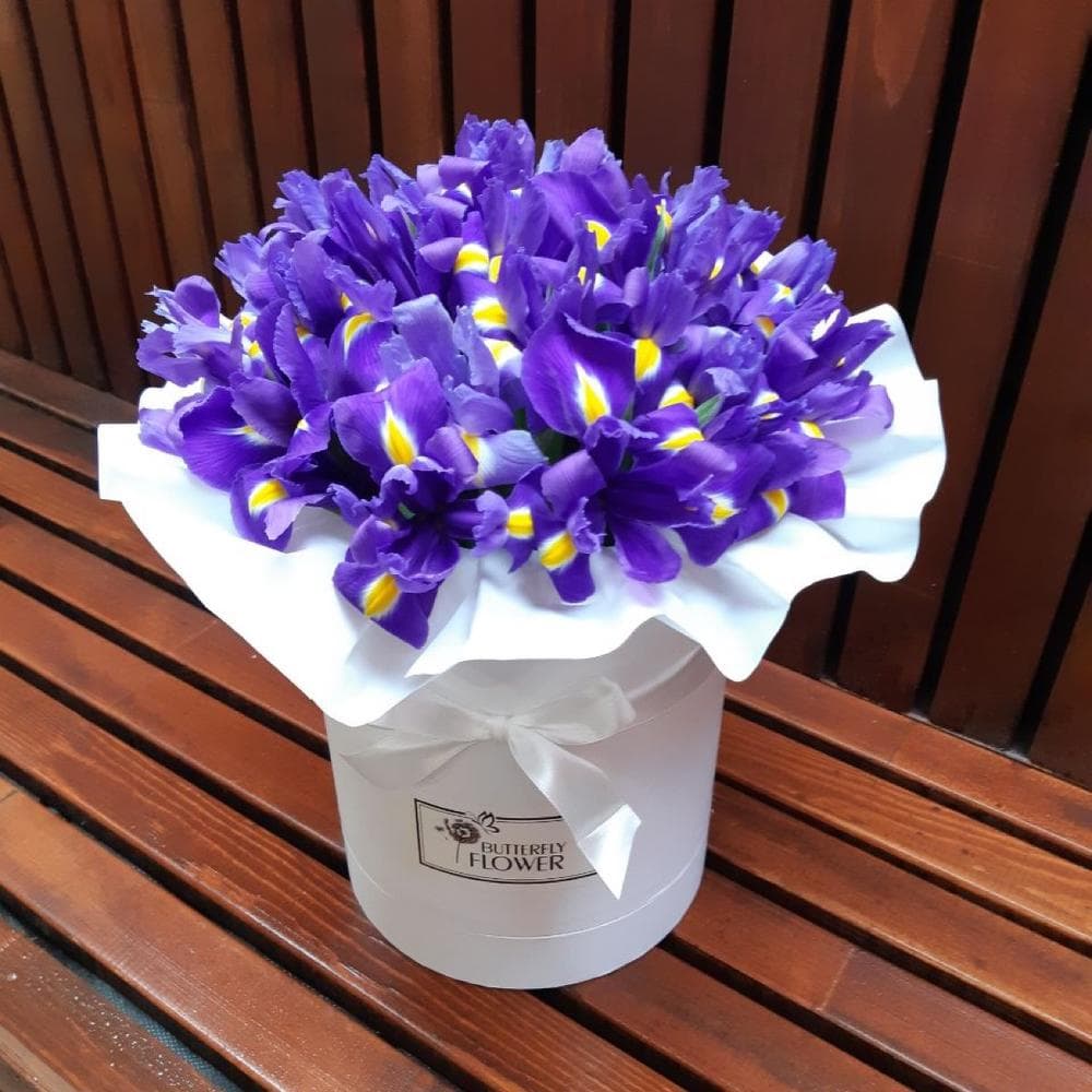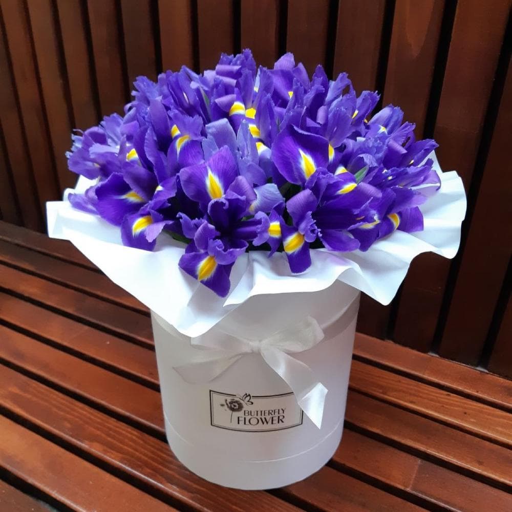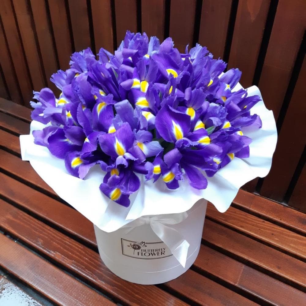 Ирис Blue Magic – 29 шт.Шляпная коробка – 1 шт.Оазис флористический – 1 шт.