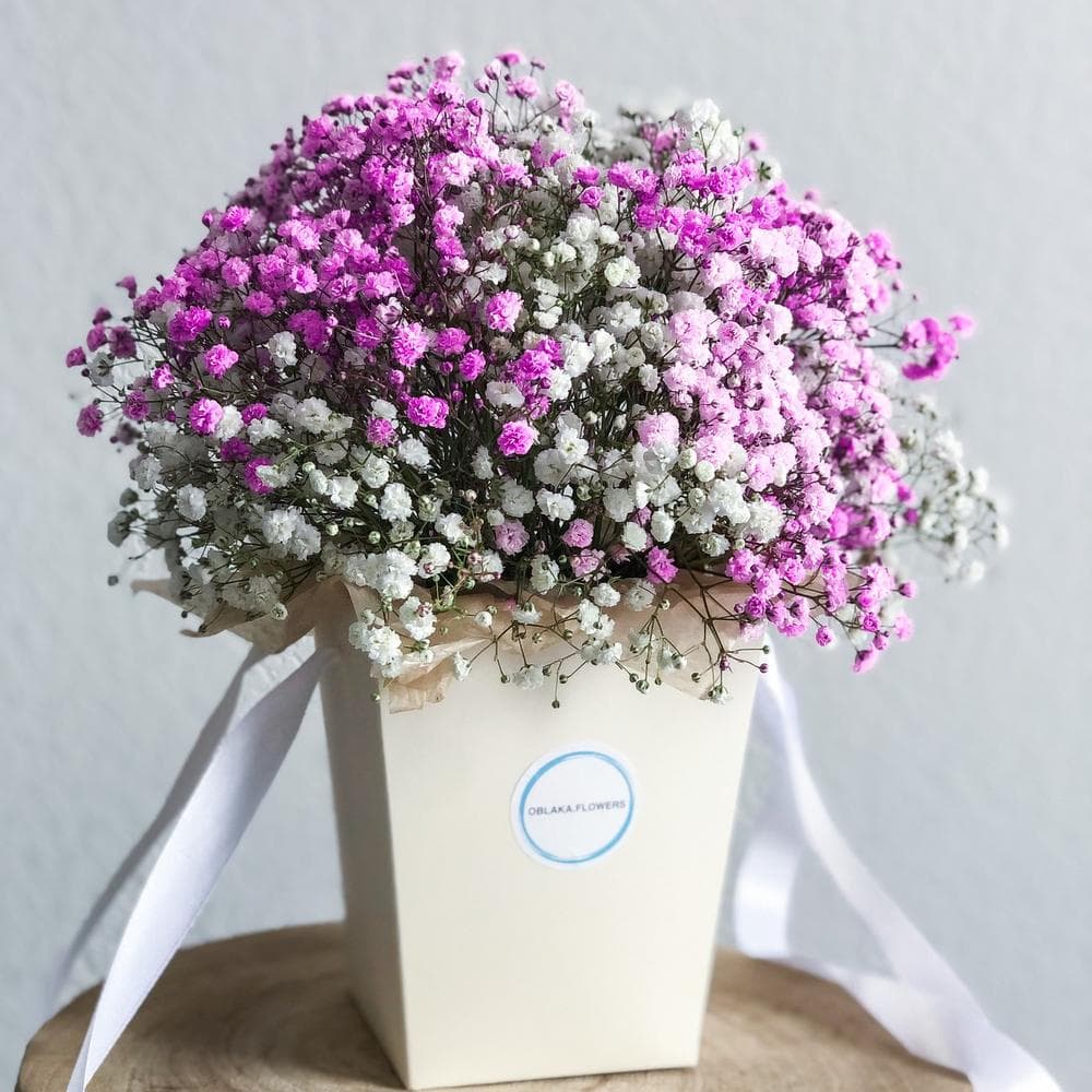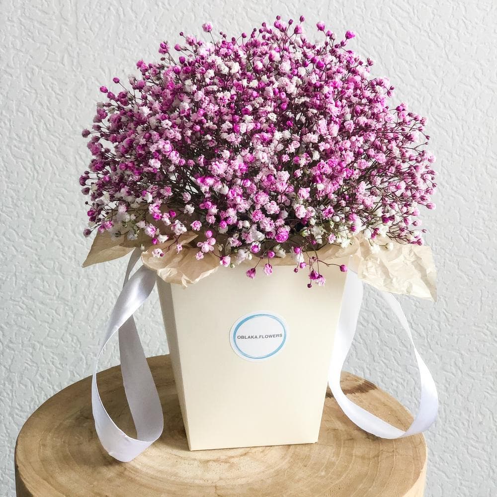 гипсофила цветная - 5 шт.Губка флористическая - 1 шт.Лента атласная - 2 шт.Сумочка картонная - 1 шт.