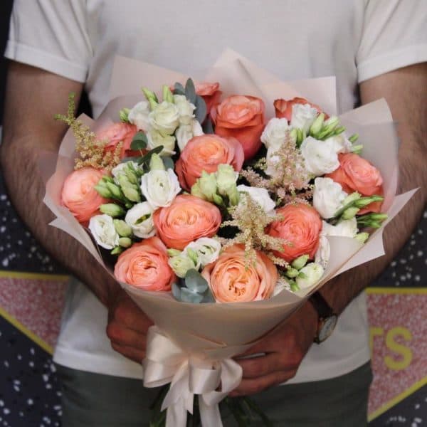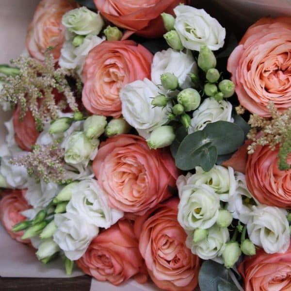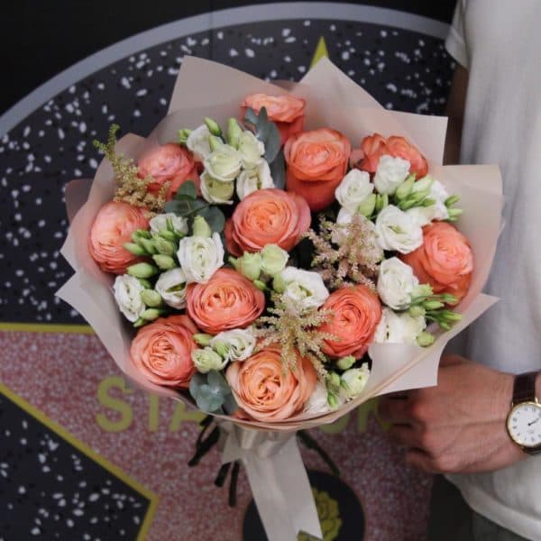Роза пионовидная кахала – 11 шт.Эустома – 5 шт.Астильба – 3 шт.Эвкалипт – 3 шт.Пленка дизайнерская – 5 шт.Лента атласная – 2 шт.