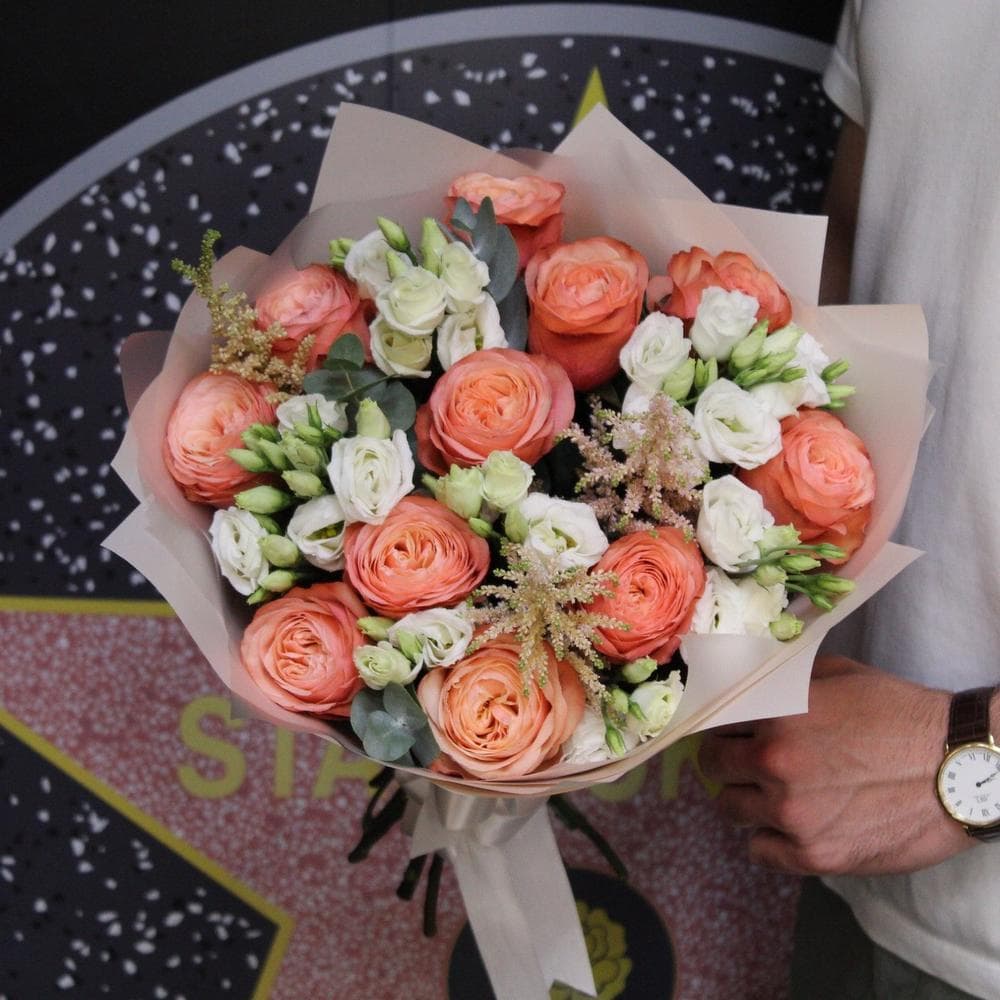 Роза пионовидная кахала - 11 шт.Эустома - 5 шт.Астильба - 3 шт.Эвкалипт - 3 шт.Пленка дизайнерская - 5 шт.Лента атласная - 2 шт.