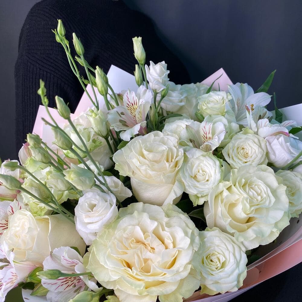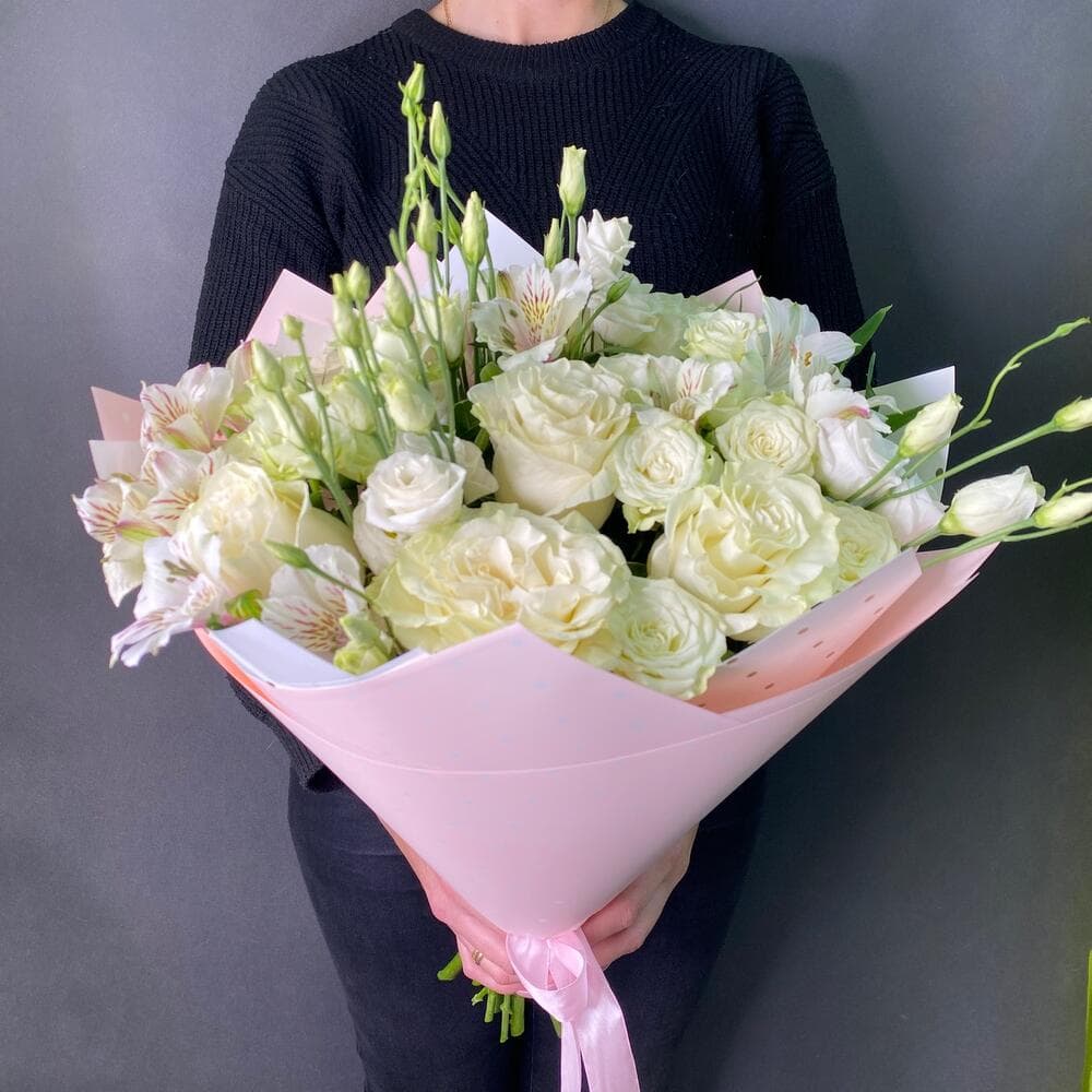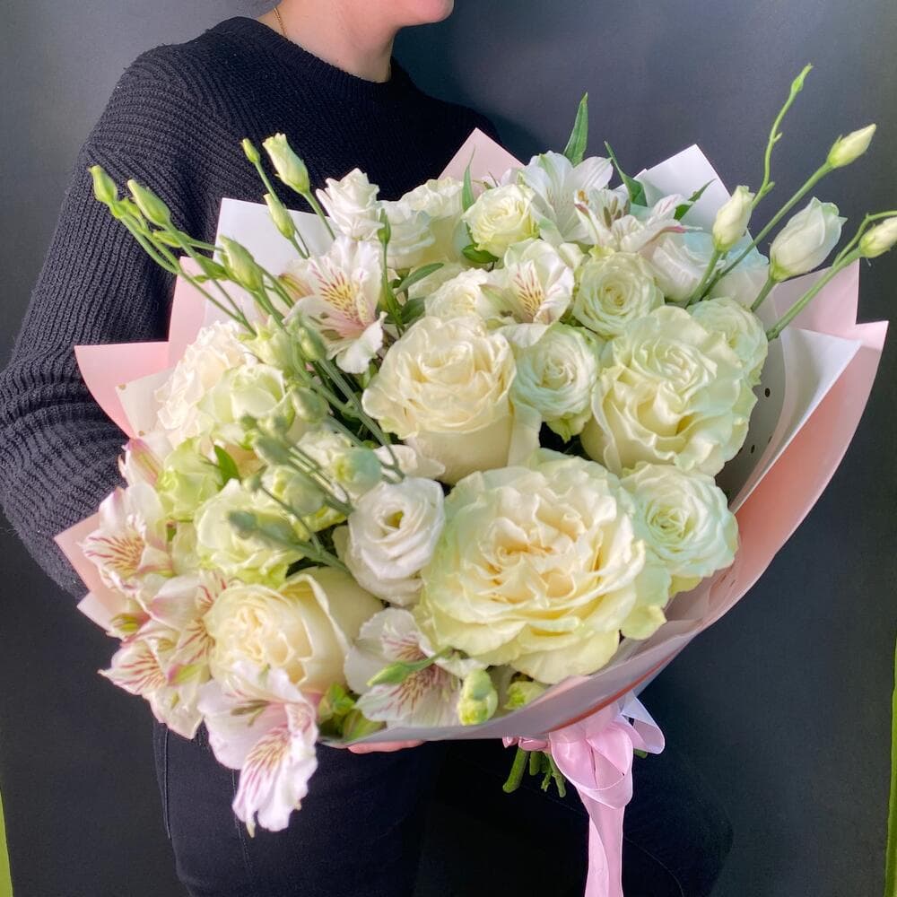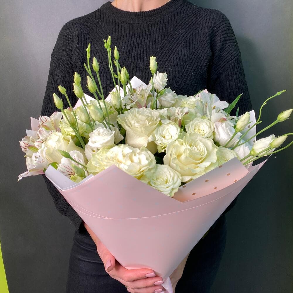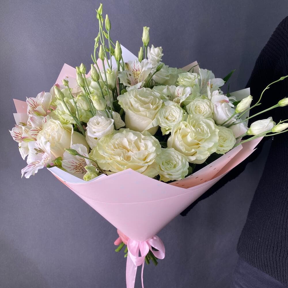 Роза Эквадор – 7 шт.Альстромерия – 3 шт.Лизиантус – 5 шт.Упаковка дизайнерская – 1 шт.