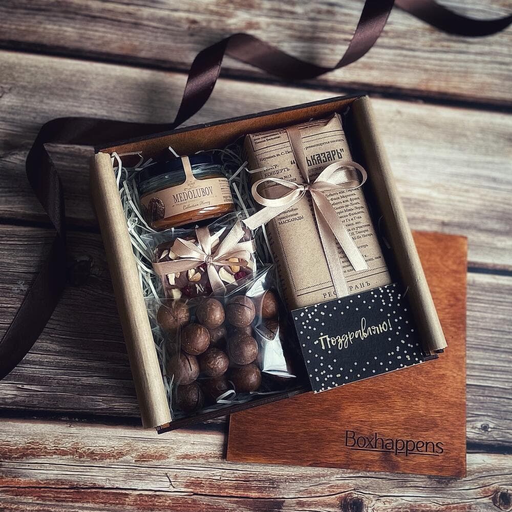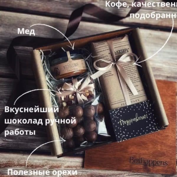 Кофе молотый – 250 гр.орехи макадамия – 100 гр.Мед суфле – 100 гр.Шоколад ручной работы – 50 гр.деревянная коробка с бантом – 1 шт.
