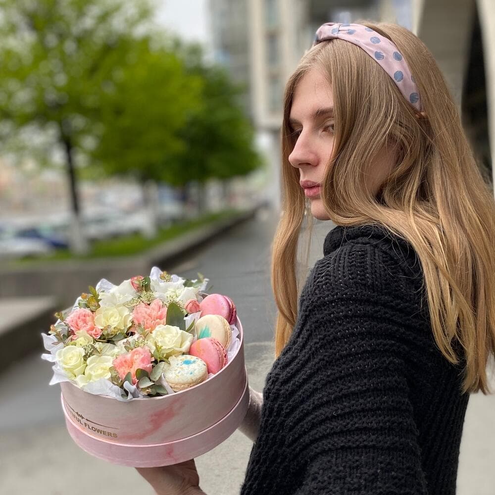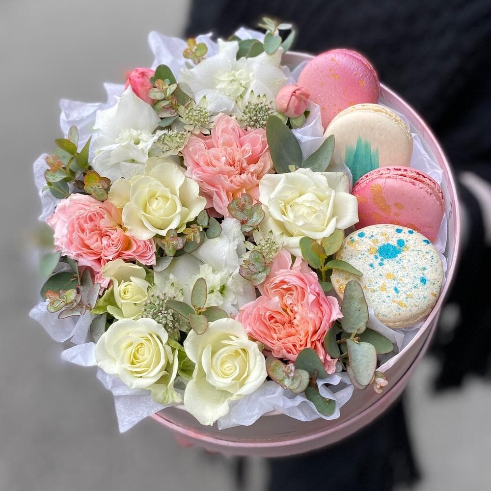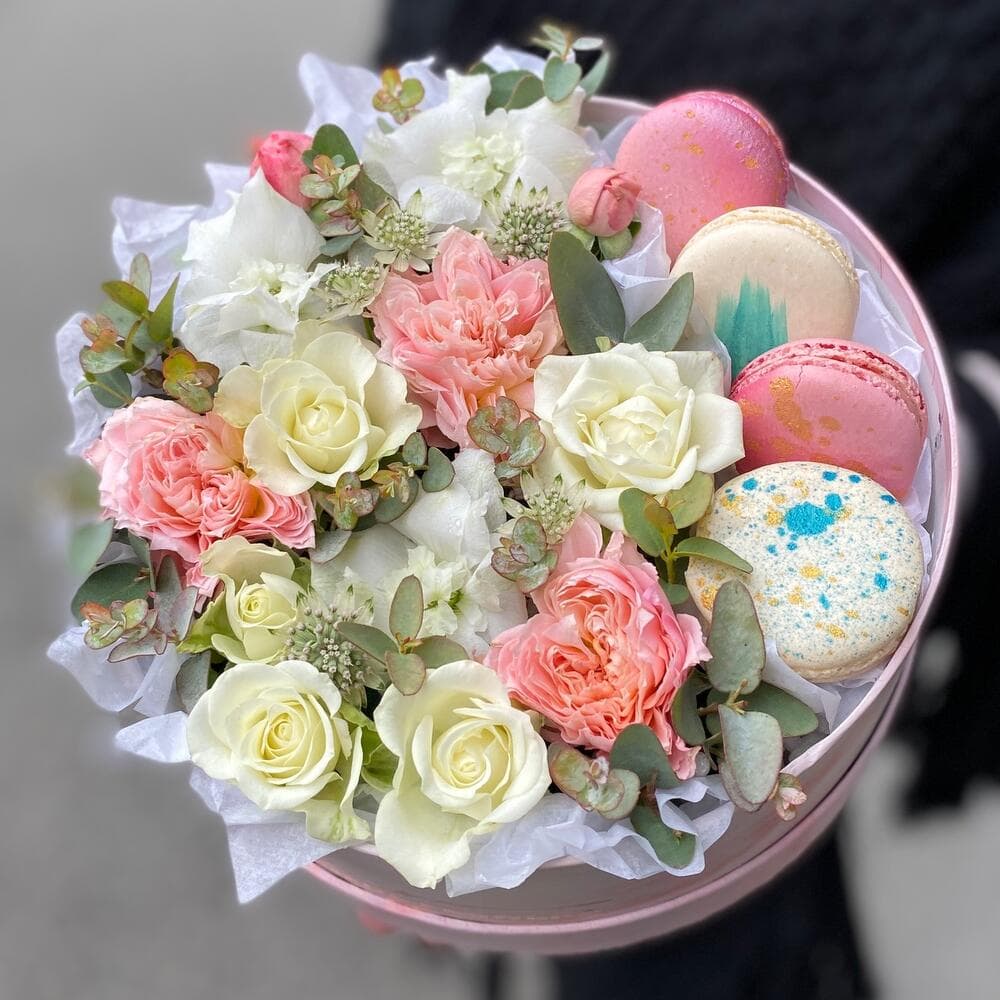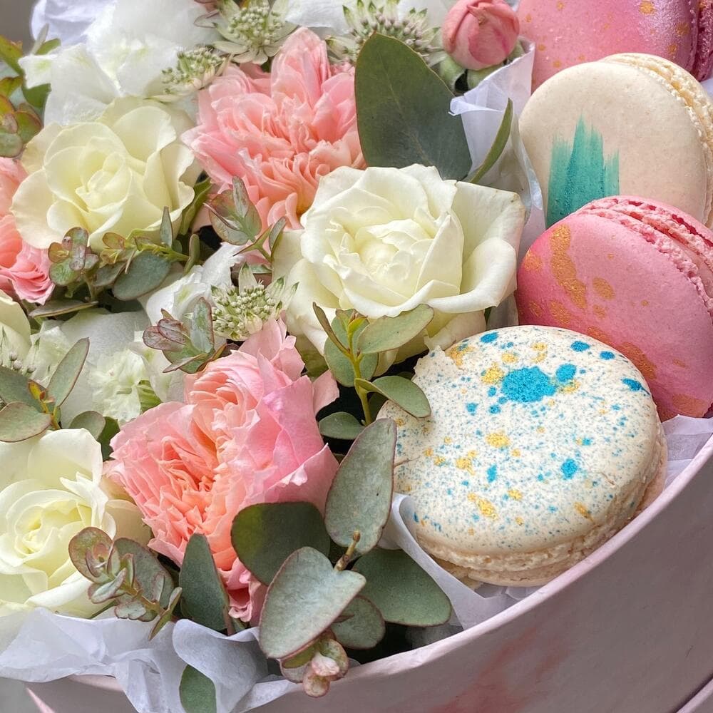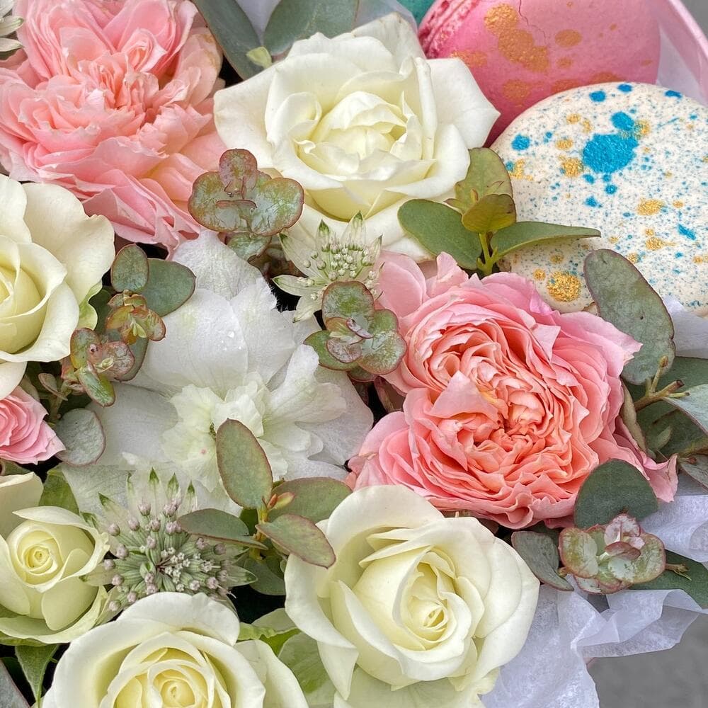 Доставка цветов в Москве—Подарочный набор с пионовидными розами, эвкалиптом и макарунами «Сладкая принцесса»