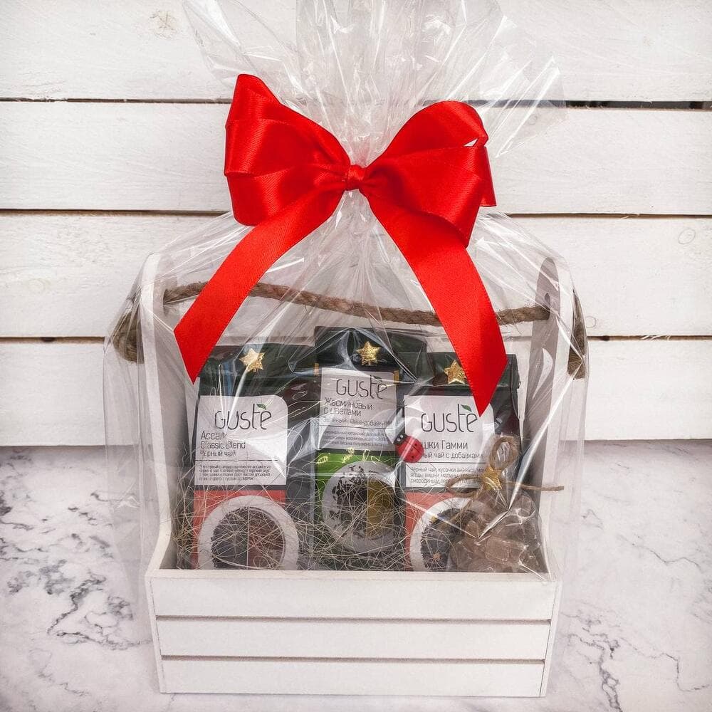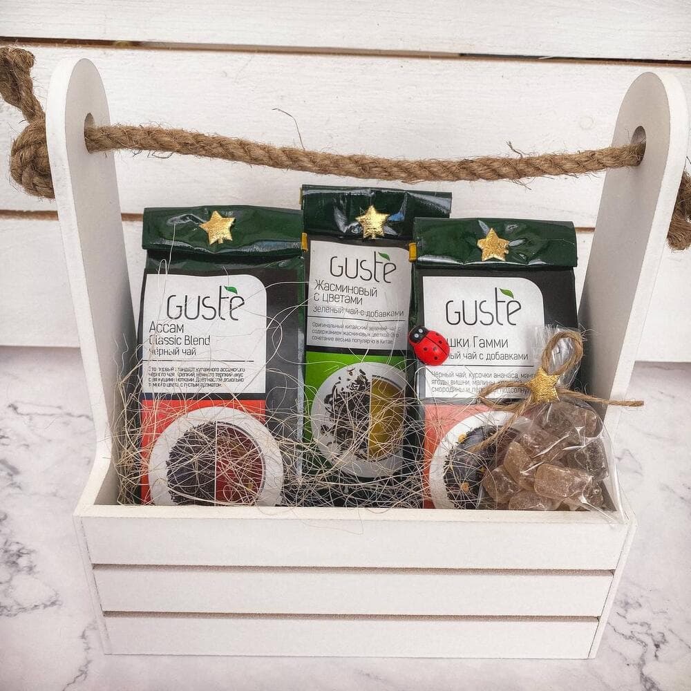 Состав (чаи Guste по 60 гр): -Ассам Classic Blend (Чёрный чай) -Жасминовый с цветами (Зелёный чай с добавками) -Мишки Гамми (Чёрный чай с добавками) -Деревянный ящичек, прозрачная пленка, бант, открытка, украшенияПодарочный ящичек в дальнейшем может использоваться как ящичек для хранения.Размер ящичка (Длина × Ширина × Высота): 21 см х 12 см х 23 см С любовью, доставка цветов Цветы Тут
