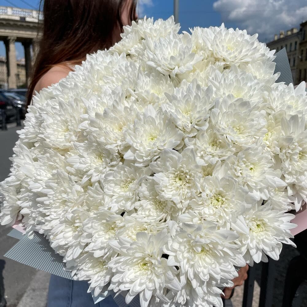 Хризантема кустовая белая - 19 шт.Упаковка дизайнерская - 4 шт.Лента атласная - 1 шт.