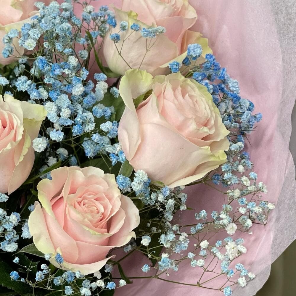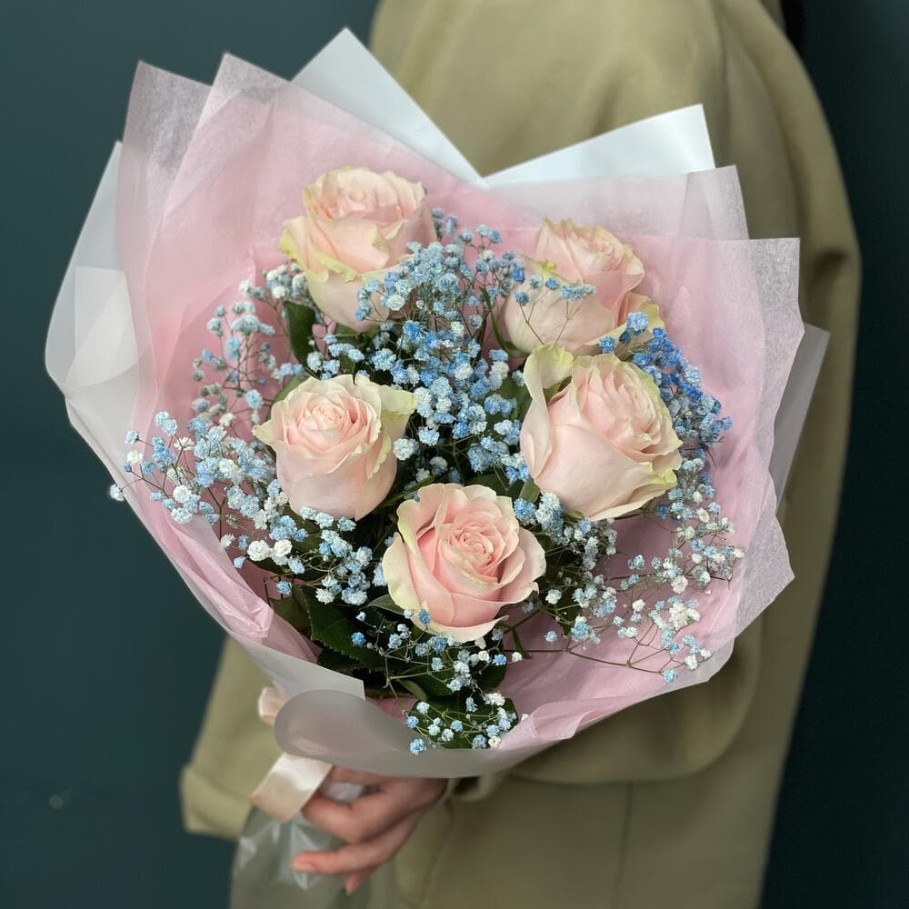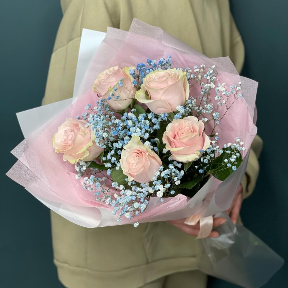 Роза одноголовая - 5 шт.Гипсофила - 1 шт.Упаковка дизайнерская - 1 шт.