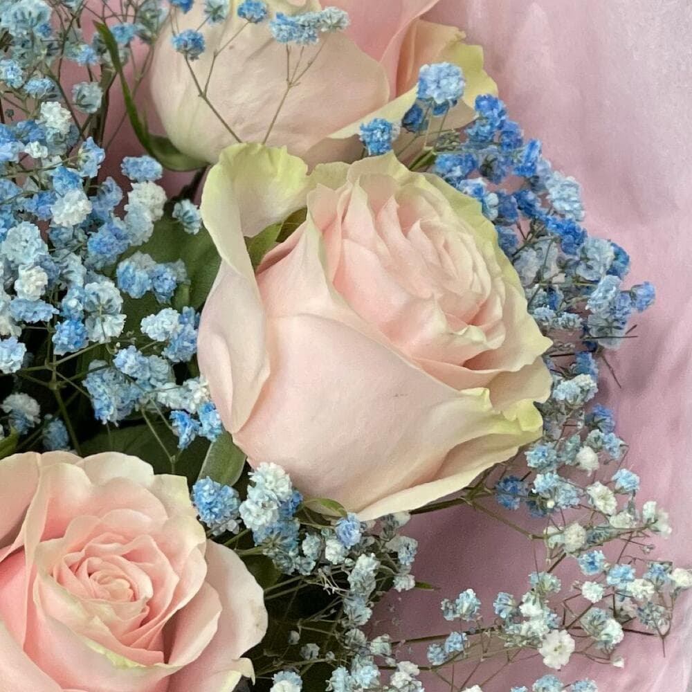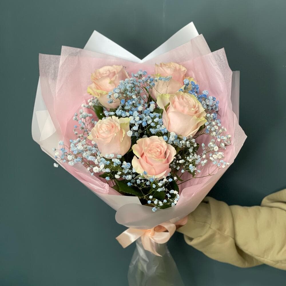 Роза одноголовая – 5 шт.Гипсофила – 1 шт.Упаковка дизайнерская – 1 шт.