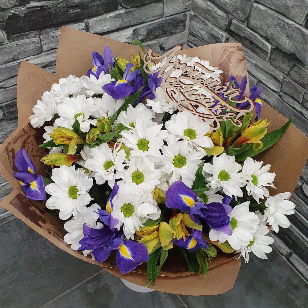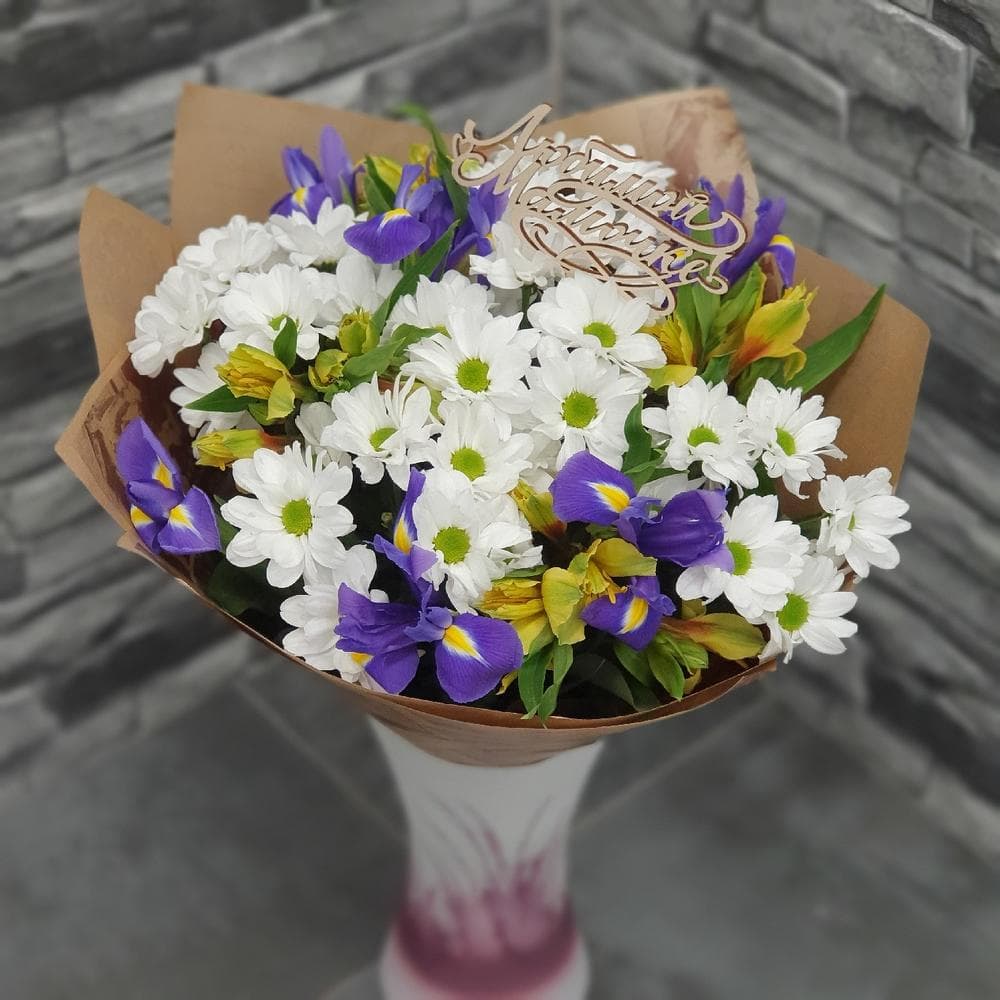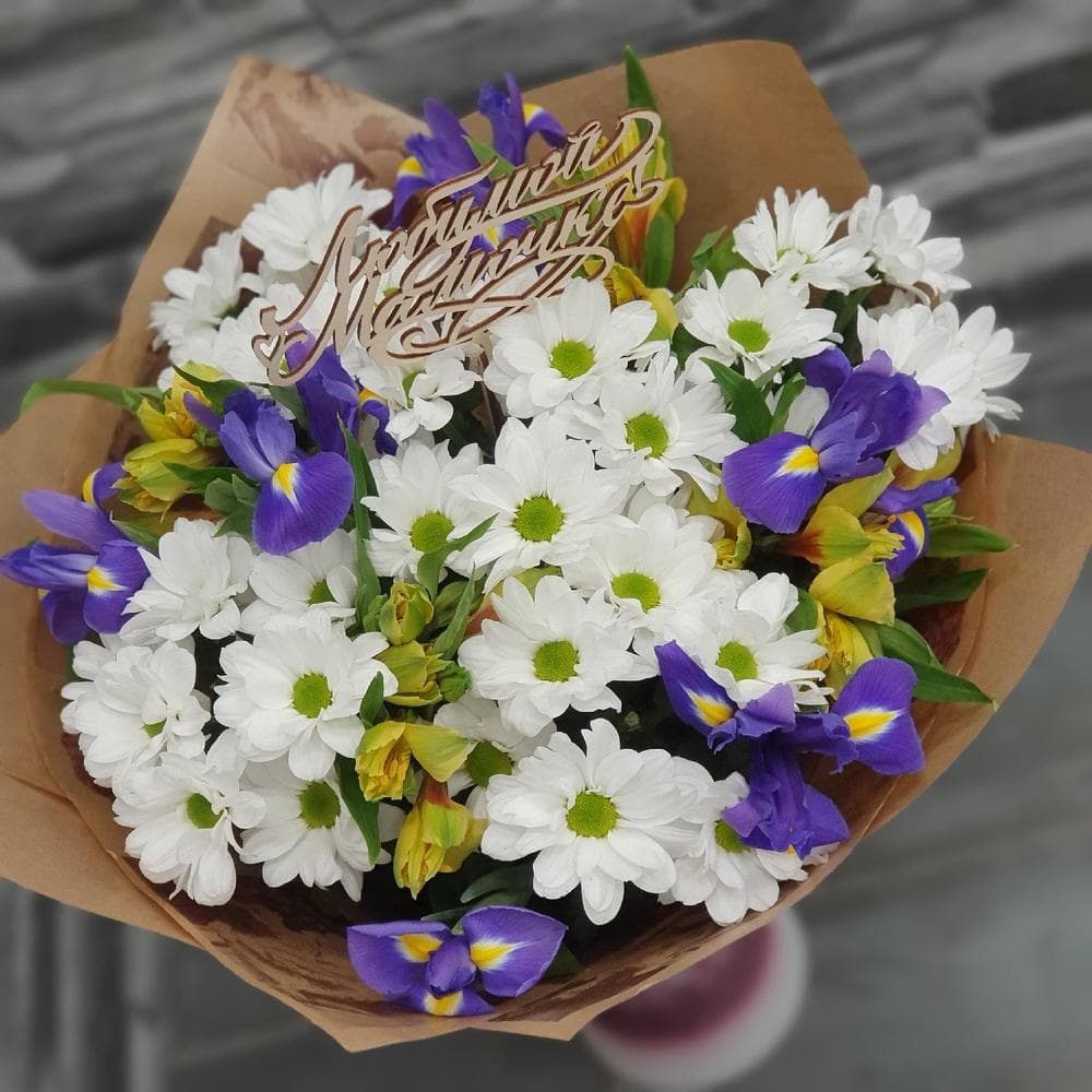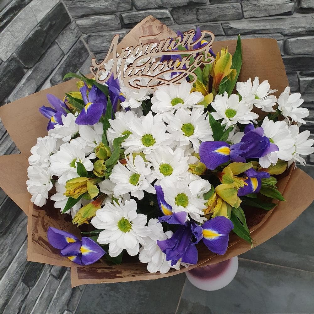 Воздушный букет с ирисами,хризантемой и альстромерией для любимой мамы С любовью, доставка цветов Цветы Тут