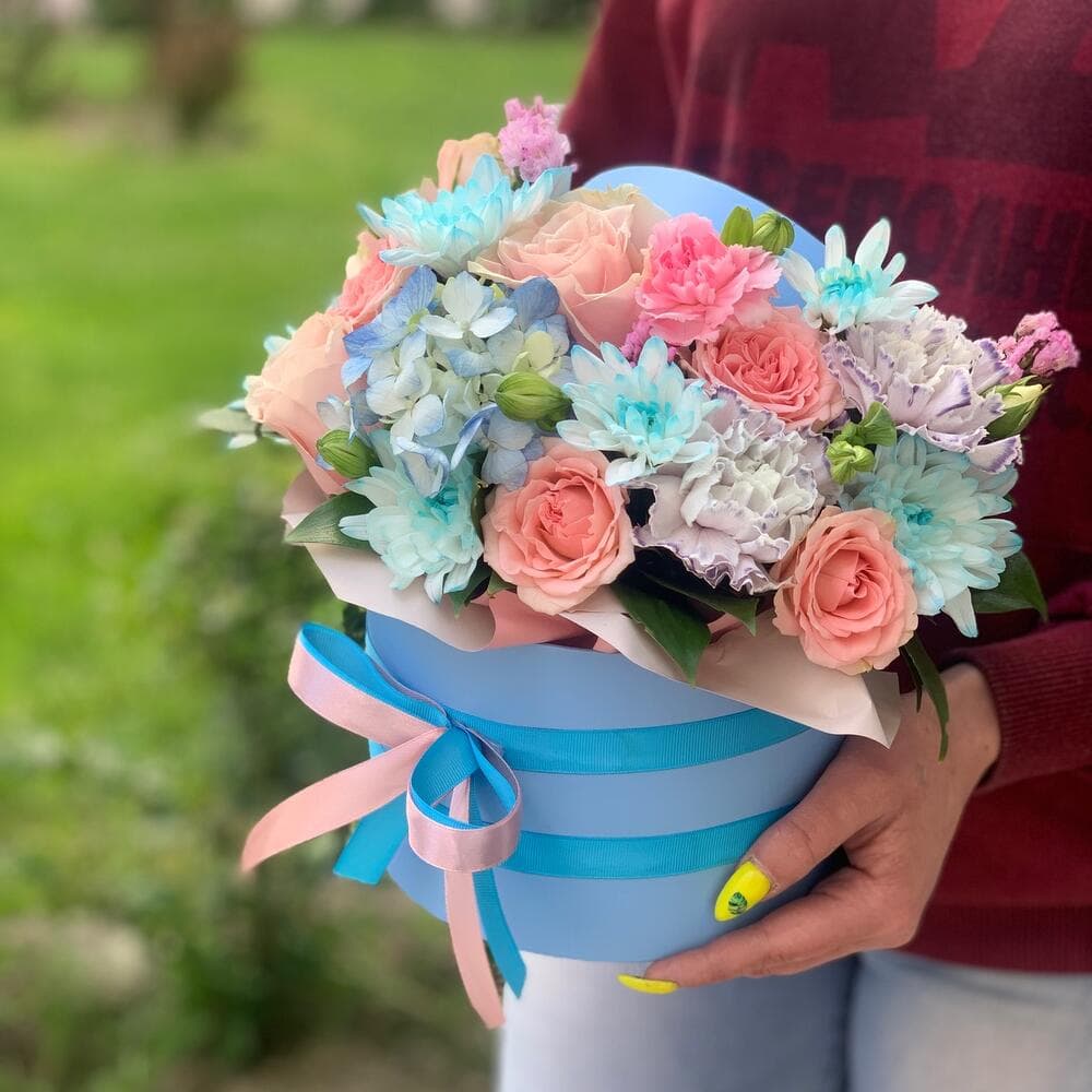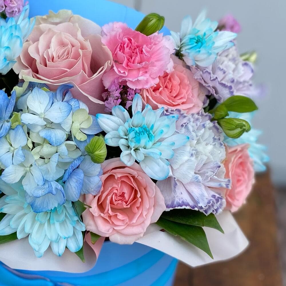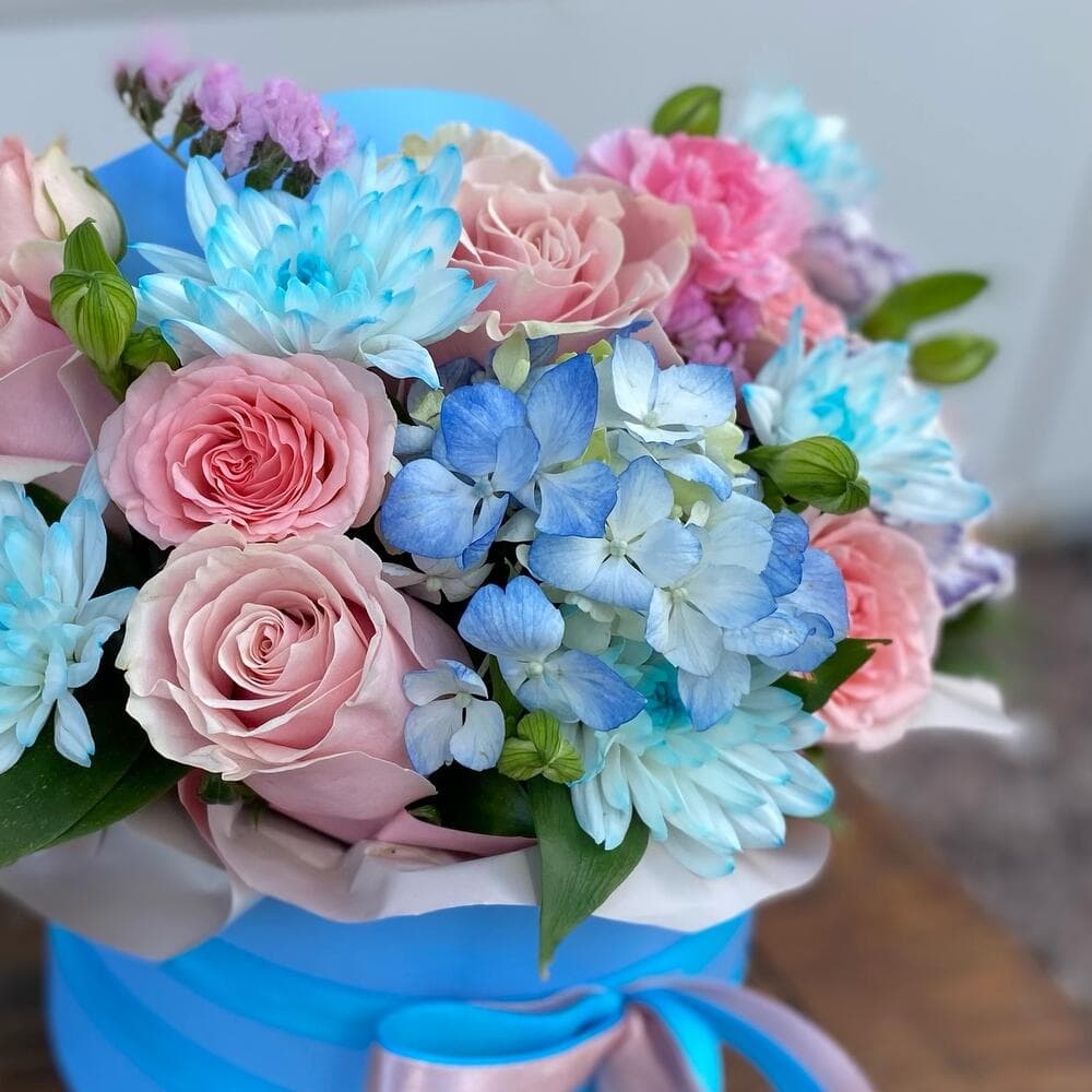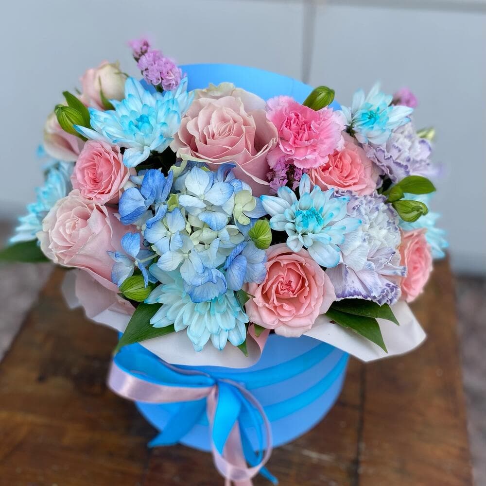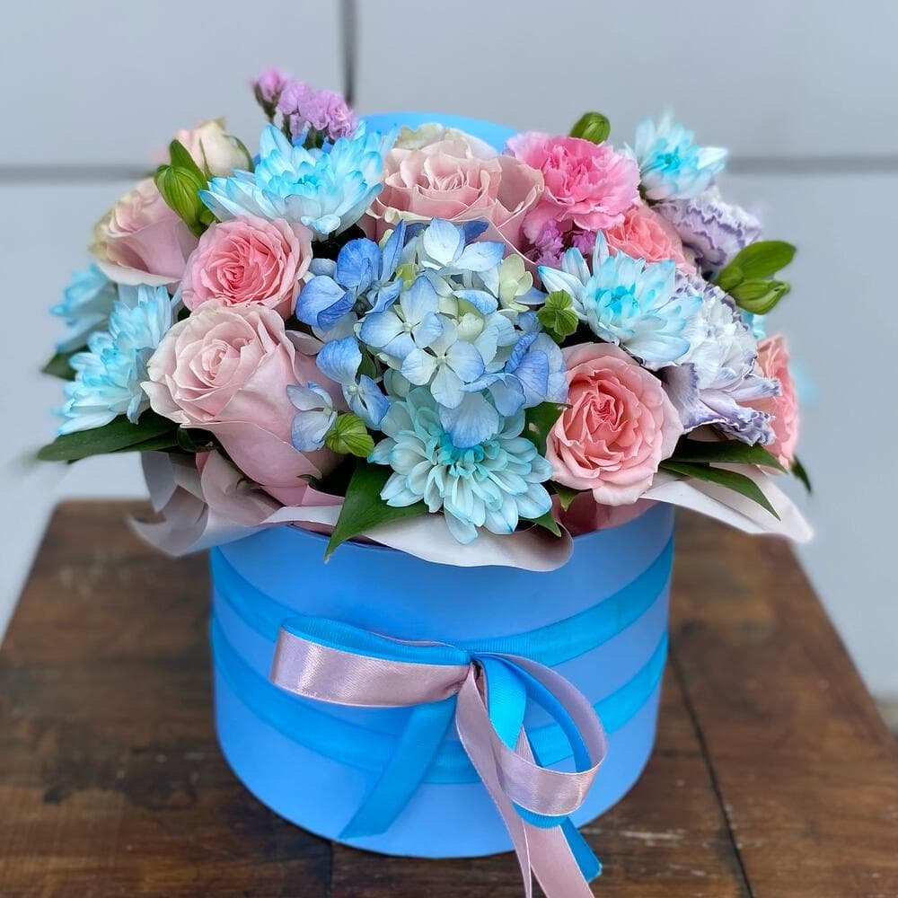 Роза – 3 шт.Гортензия – 1 шт.Хризантема кустовая – 1 шт.Гвоздика – 3 шт.Коробка шляпная – 1 шт.