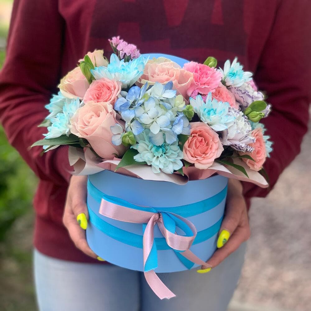 Роза - 3 шт.Гортензия - 1 шт.Хризантема кустовая - 1 шт.Гвоздика - 3 шт.Коробка шляпная - 1 шт.