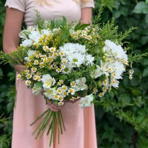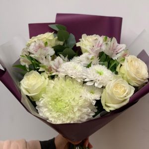 Букет из белых роз, хризантем и альстромерий