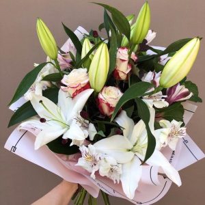Праздничный букет с лилиями и розами
