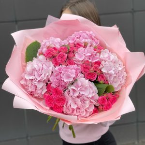 Букет из гортензий с кустовыми розами