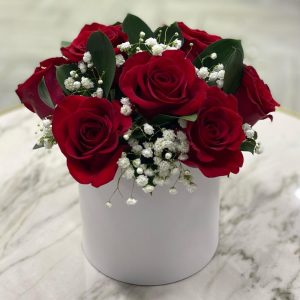 Коробочка с красными розами и гипсофилой