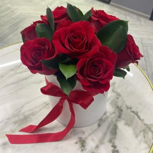 Красные розы с зеленью в шляпной коробочке