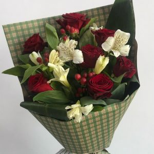Букет с розами, альстромериями и гиперикумом