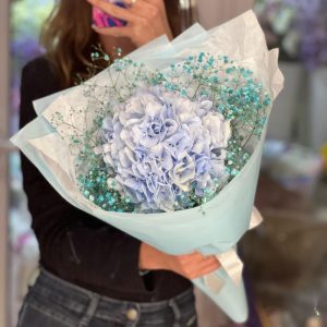 Букет с голубой гортензией и гипсофилой