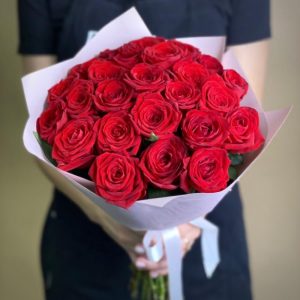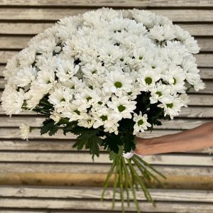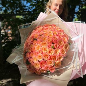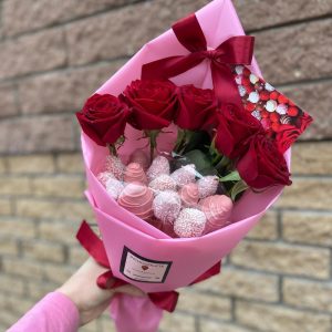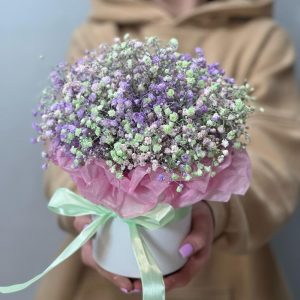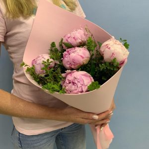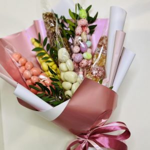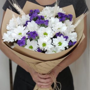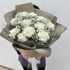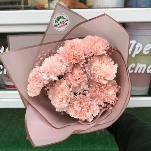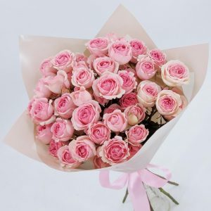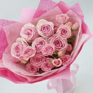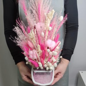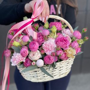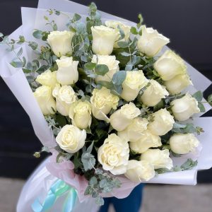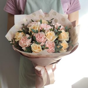 Белые орхидеи с розовыми кустовыми розами и эвкалиптом