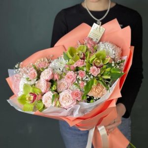 Кремовый букет с орхидеей и кустовыми розами (028)