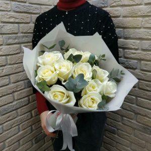 Букет из 7 белых роз с эвкалиптом
